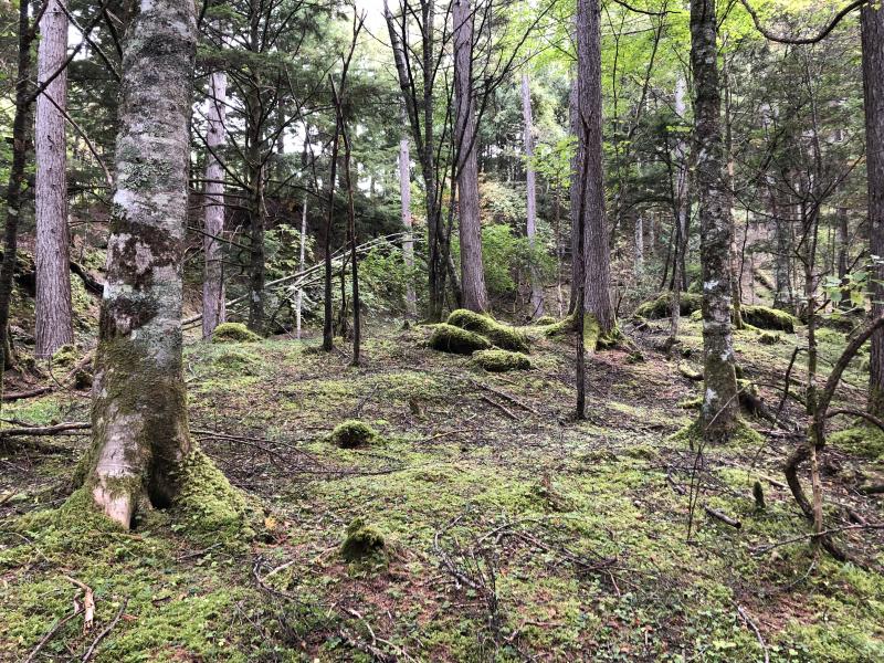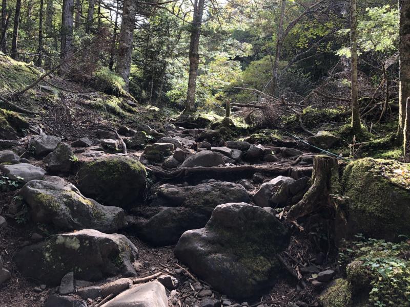 軽く休憩をとり北沢との分岐から南沢へ。ここからやっと登山スタートの雰囲気になります。しばらく八ヶ岳らしい苔むした樹林帯を進み、右へ左へ沢を渡ります。平時は足が水につかることはありませんが、増水時は登山道が川のようになるルートなのでそんな時は北沢を通ってください。