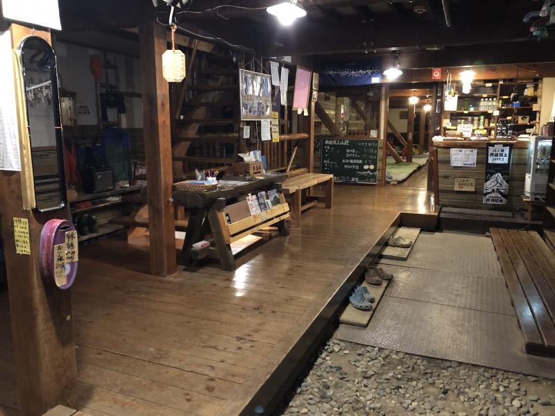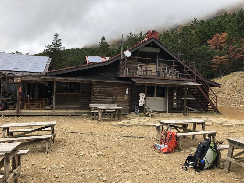 次第に岩だらけになる道を120分ほど登ると広々とした行者小屋に到着。(気温10度)