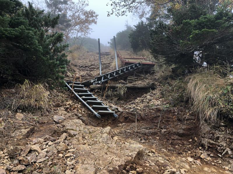 翌日の予報が強風悪天候だったため、今回は核心部の難易度が高い文三郎尾根を初日に登ります。階段を避けて中岳経由ルートも考えたのですが、天気が崩れそうだったので少しでも行動時間の短い文三郎をチョイス。そして、樹林帯を抜けた先にある先の見えない階段を見て後悔。登っても登っても湧いてくる階段。いや、この階段がなければもっと大変な登りになることは分かっており、大変ありがたいのですが、、、わかってはいるのですが!ゴニョゴニョ
