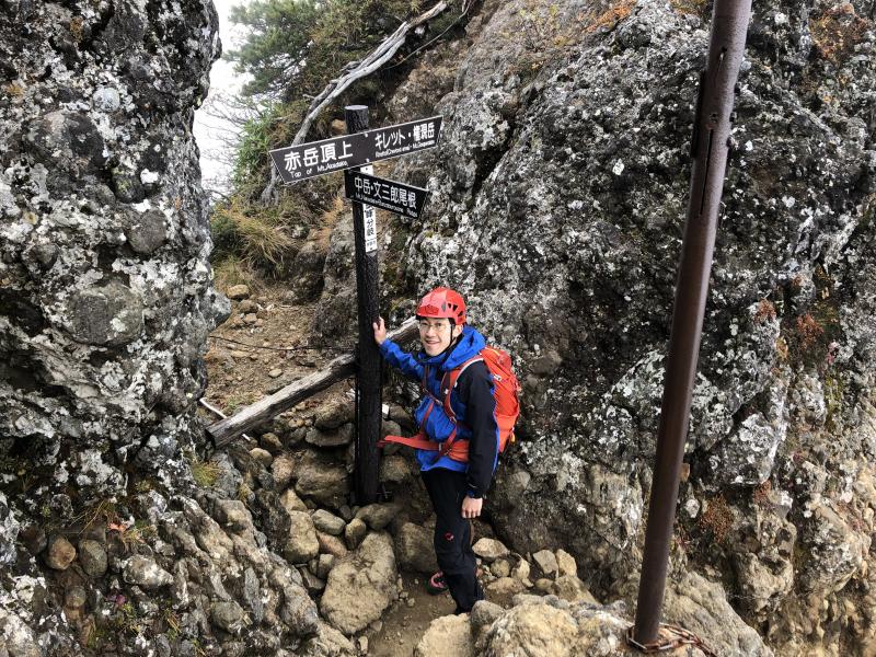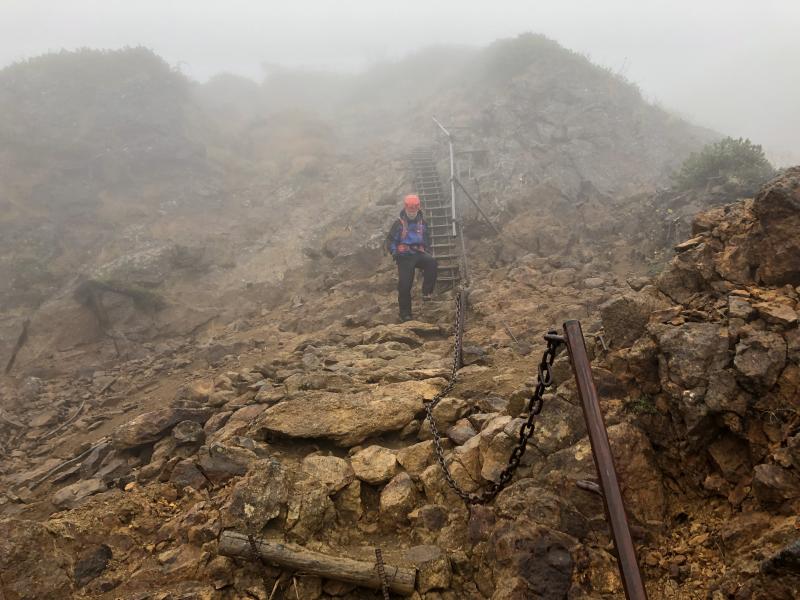 三点支持で確実に確実に。ガスが掛かり視界は悪いが岩は乾いているので快調な登り。どんどん高度を稼ぐと目の前にハジゴがっ!ハシゴが出ればリーチです、確変です、頂上です!