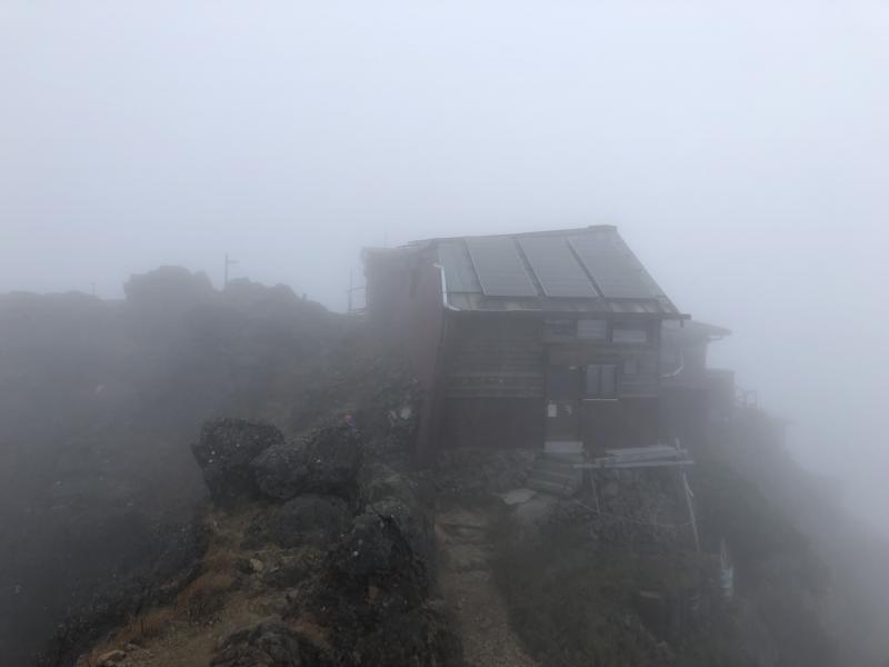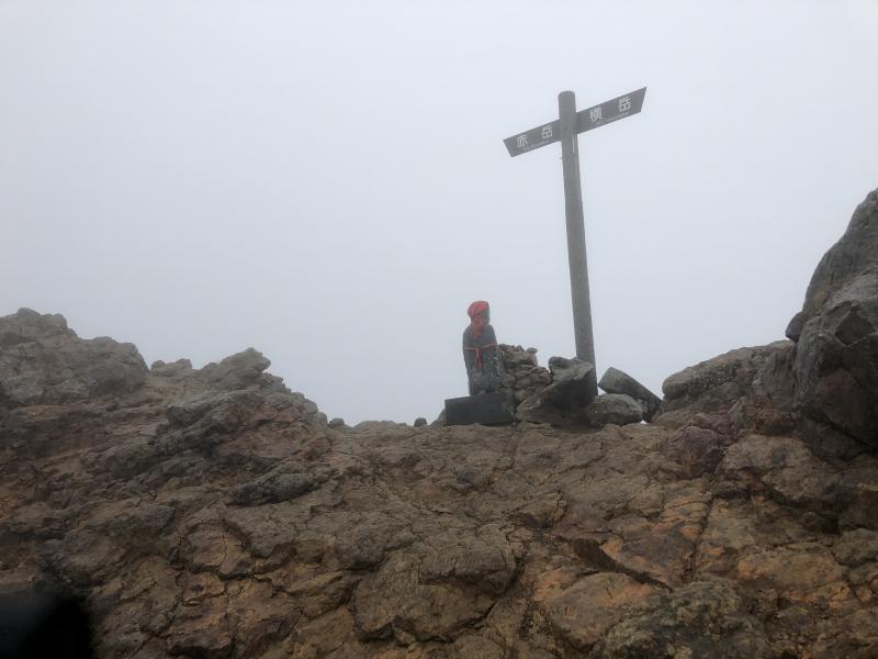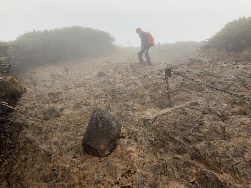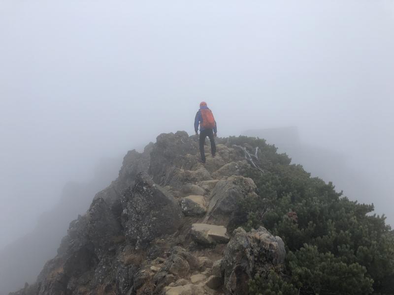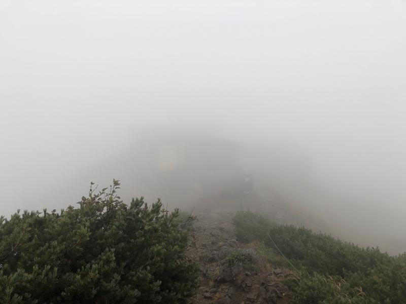 2日目は朝からガスで視界10m。頂上付近は気温5度。風速19mで時折雨。岩が濡れてグリップが効かない。