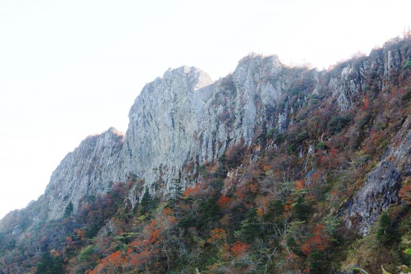 基部からは、不明瞭です。笹をかき分け、笹道の急登りを越えると、カニの横ばいの岩場が始まります。このあたりも、足元注意が必要です。紅葉は最高です。反対側の墓場尾根がそそり立ちます。美しい。