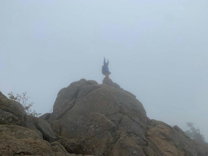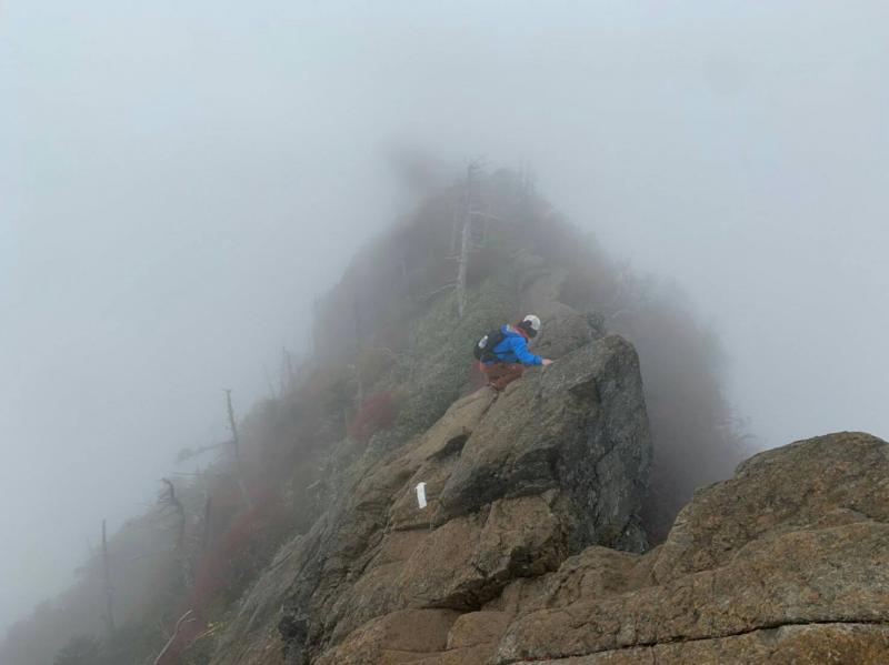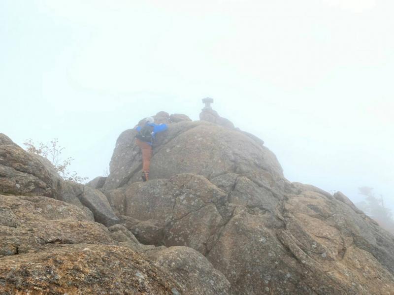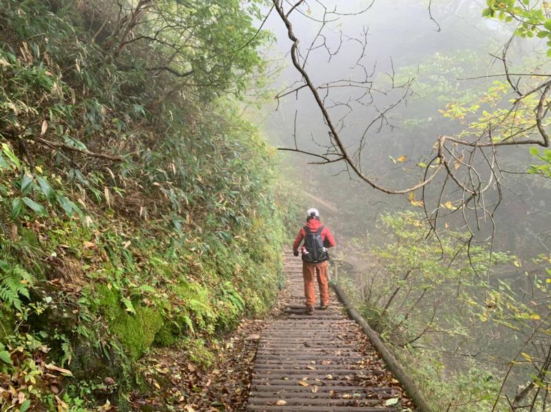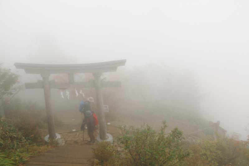 - 湿ったガスの中、丸太道が滑りやすく登りも下りも注意が必要でした。
