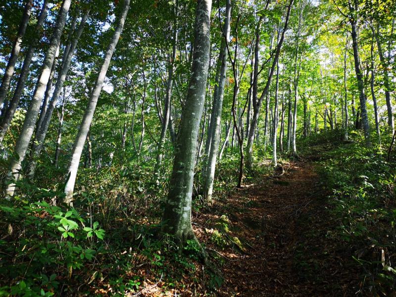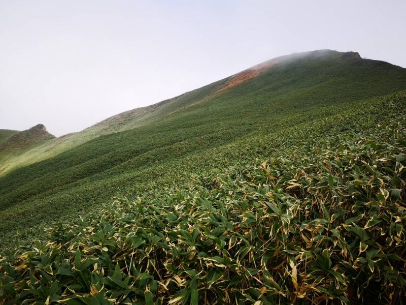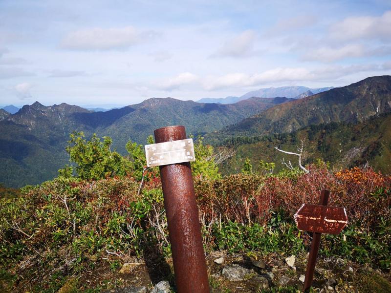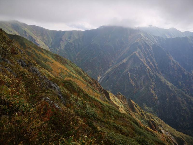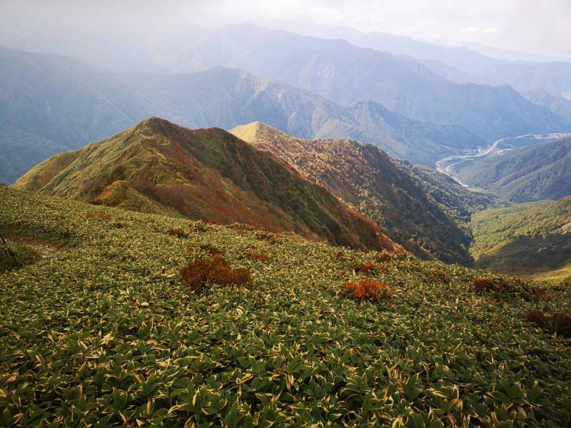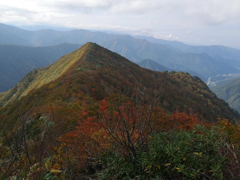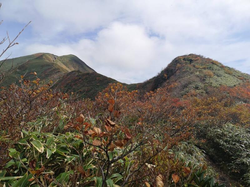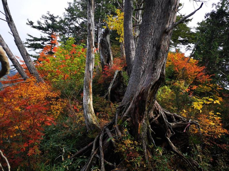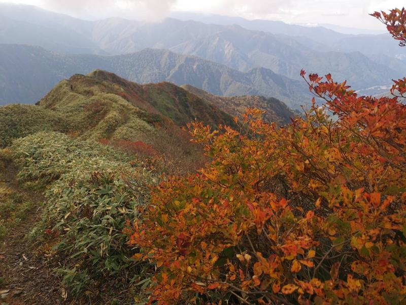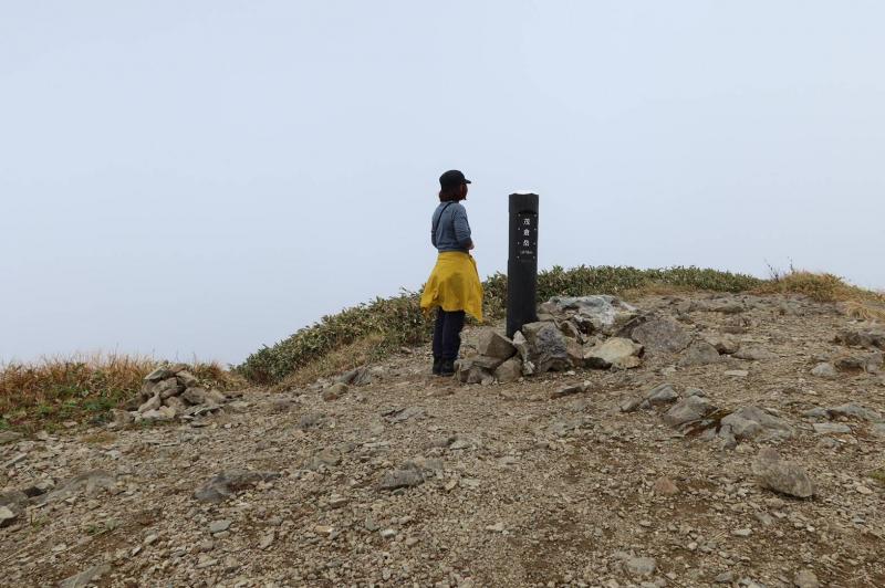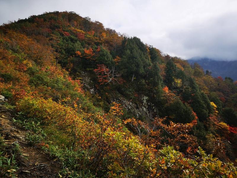 山頂はガスで覆われ展望ゼロ、ほんの少しだけ余韻を味わってからすぐに下山。下れば下るほど視界が開けて、登りではあまり意識していなかった紅葉に目を奪われました。
