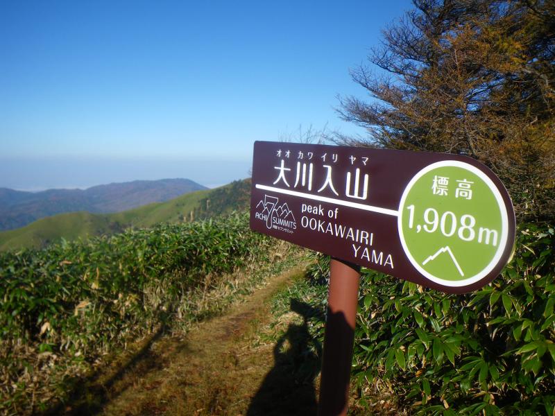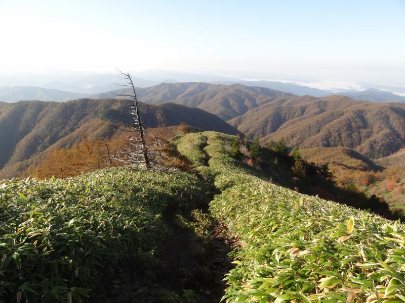大川入山は特に、頂上直下のこの笹の斜面からの眺望はすばらしく、白くなった中央アルプス・南アルプスや愛知県側の茶臼山などが確認できました。