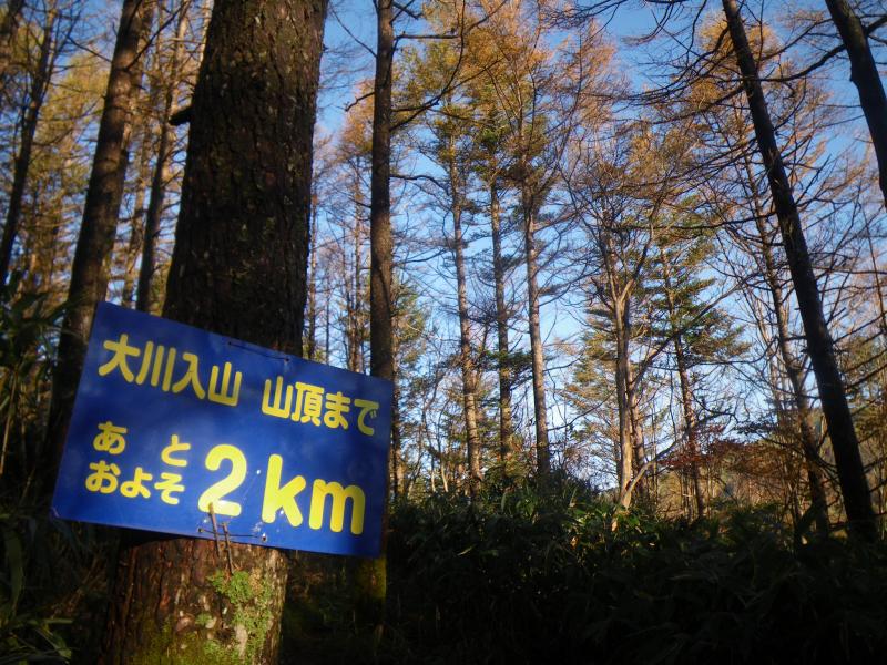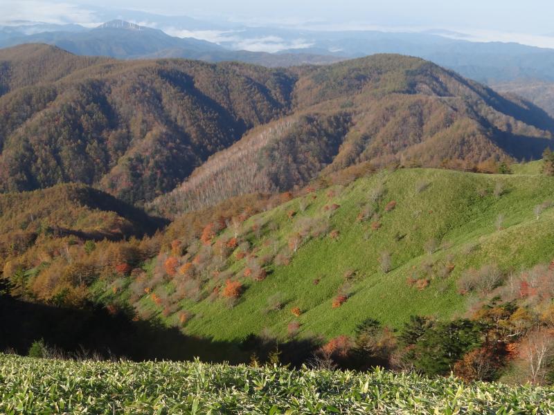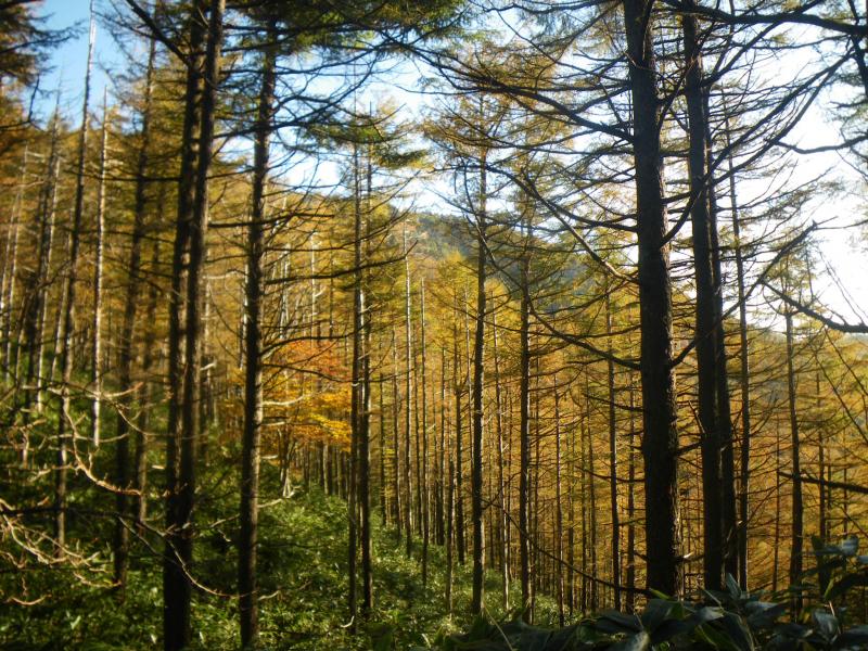 以前も治部坂高原から登っていますが、木の根っ子の凍結でとても歩きにくい覚えがあり、ここを下るのを避けて、あららぎ高原側に下山する周回コースにしました。太陽の当たり具合からして、早朝から登った上で朝には山頂付近に着くと赤い羊がきれいに撮れると考えて6時15分には出発、国道を走るコミュニティーバスをうまく使う為には持ち時間は約4時間でなるべく急いで歩くことにしました。もちろん今の時期は木の根っ子の凍結はなく、一気に横岳まで駆け上りました。横岳から2つの小ピークを越えていきますが、まだまだ遠くなかなか大川入山の懐には入りませんが、傾斜も緩く快適な尾根道が続き、カラマツの紅葉がなかなかきれいです。また最低鞍部付近は紅葉真っ盛りで熊笹とよくマッチしていました。最低鞍部からしばらくすると熊笹帯が出現し、いよいよ赤い羊地帯です。1週間くらい前が見頃だった感じですが、赤い羊は見れました。鈴鹿の竜ヶ岳に比べ、規模も小さく遠方なので私のカメラではうまく上手く写りませんが雰囲気は撮れました。