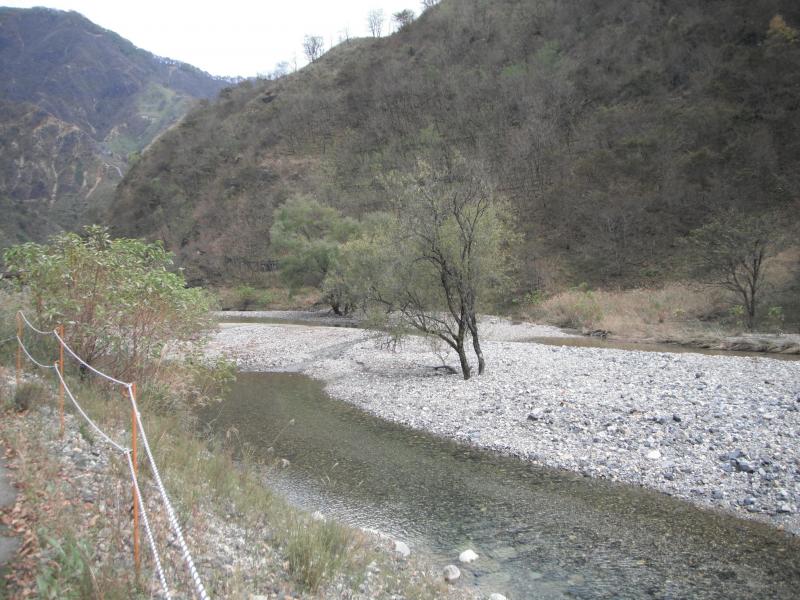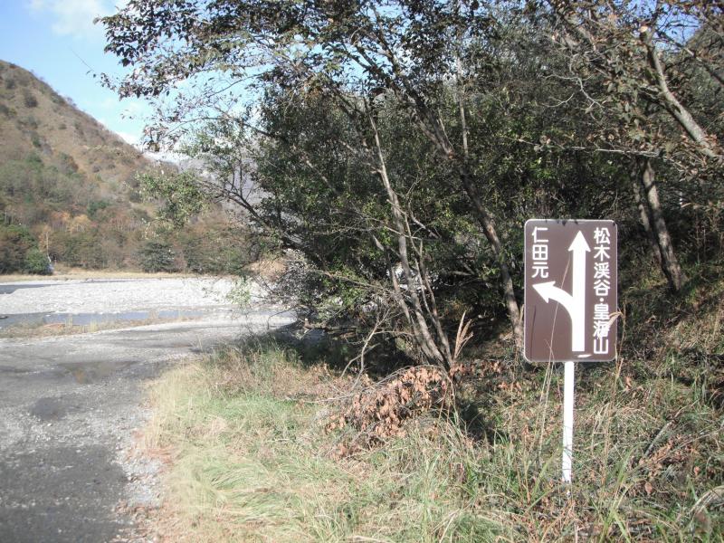 銅親水公園の駐車場に車を駐め、歩き出します。登山口へ向かう林道は工事車両も通るため注意しつつ進みます。仁田元川の左岸に沿って歩いて行くと、地形図の917mの標高点のあたりが登山口です。標識はありませんが赤テープで印がされています。