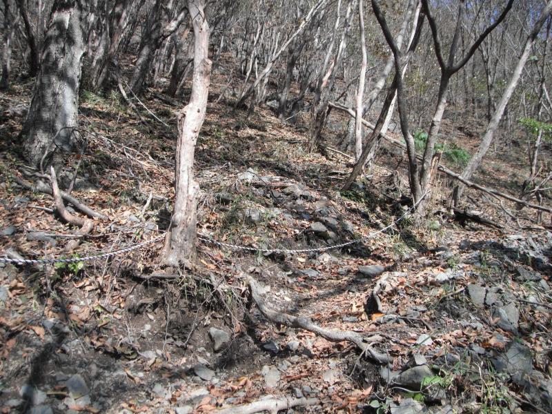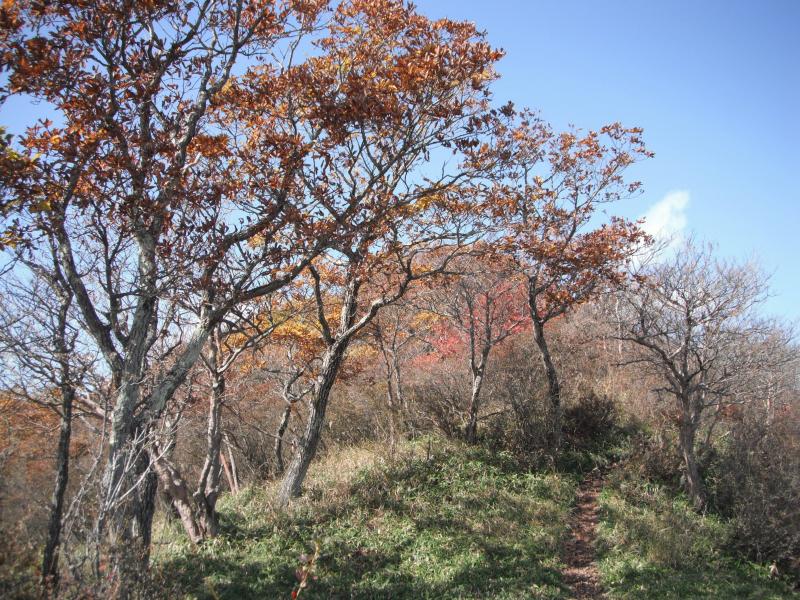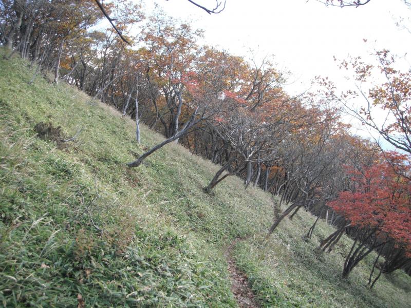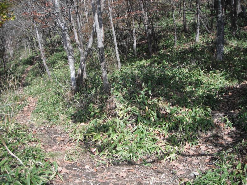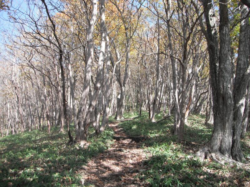 さてのんびりしたら下山です。ブナの脇に伸びる道、これはさっきの巻道に通じているのでは?と行ってみるとドンピシャリ!登り返しがなく、楽に下山できました。右上の地図にピンクの線で示しているのが巻道です。