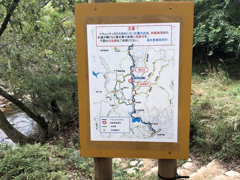 ・東門から退出するとトゥエンティクロス。途中、高雄山の西側を迂回する案内があります。かなり大幅に崩れた箇所があるため、トゥエンティクロスをそのまま下るのはおすすめできません。