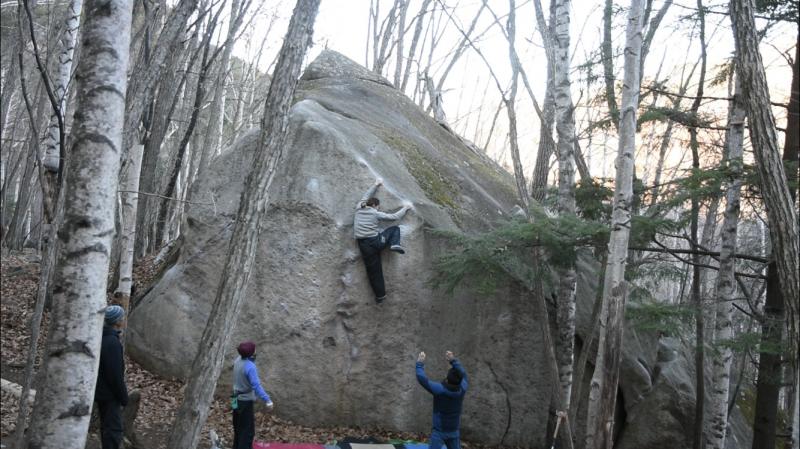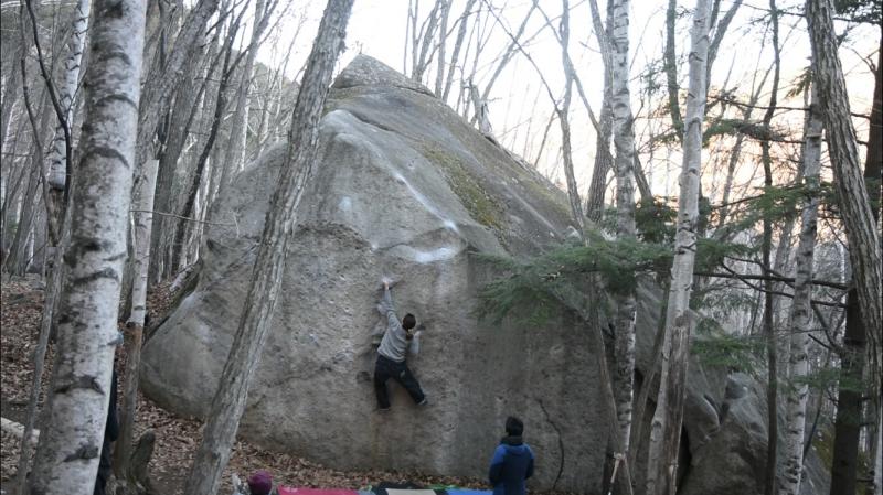 小川山のド定番課題!手数は多くないですが、細かいカチやスローパーをにぎってヨレ気味のタイミングで高さのあるリップに手が届くので、トップアウトが怖かったです。1日目にリップまで到達しましたが左足がスリップしてしまい完登ならず。そのあとはどんどん高度が落ちました。2日目はアップして前腕がパンプしたところでビッグレストを取り、いざトライ!それまでは自分でも確証を持てないまま1手1手出していましたが、レストが効いたのかパシパシと止まって、気持ちよく完登できました。