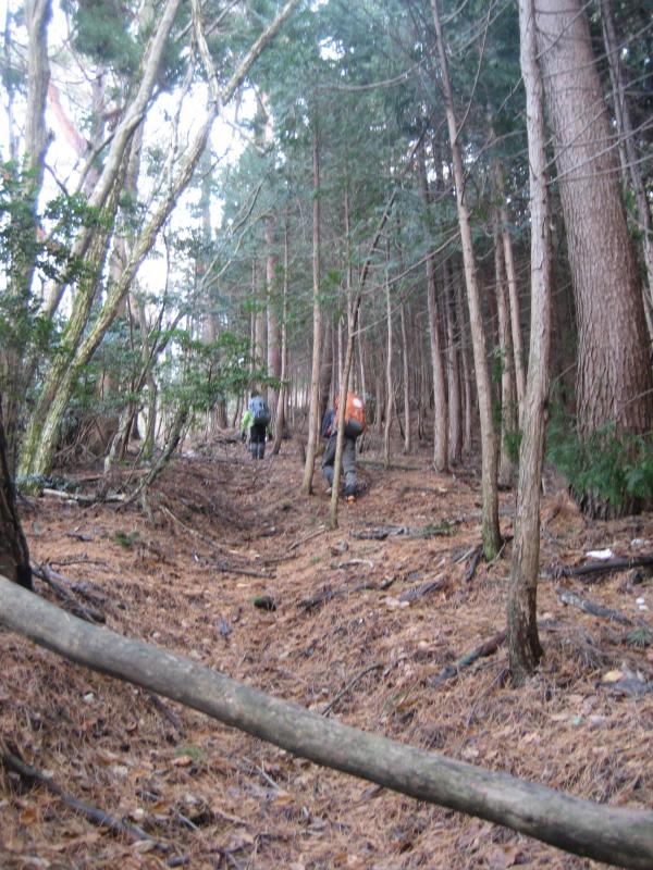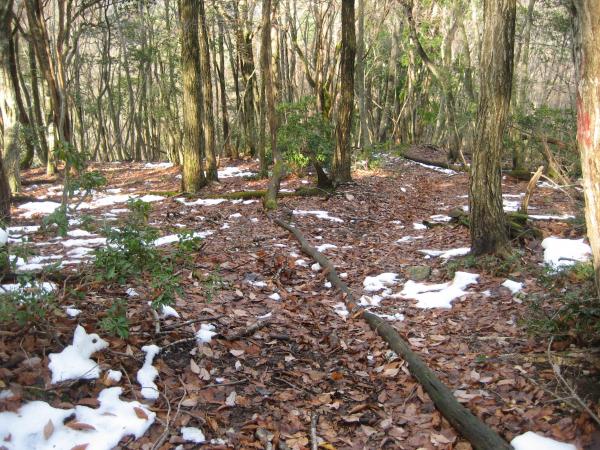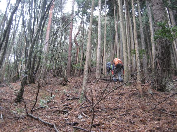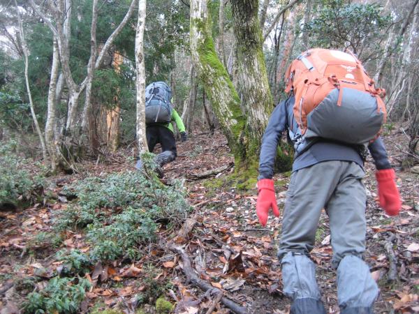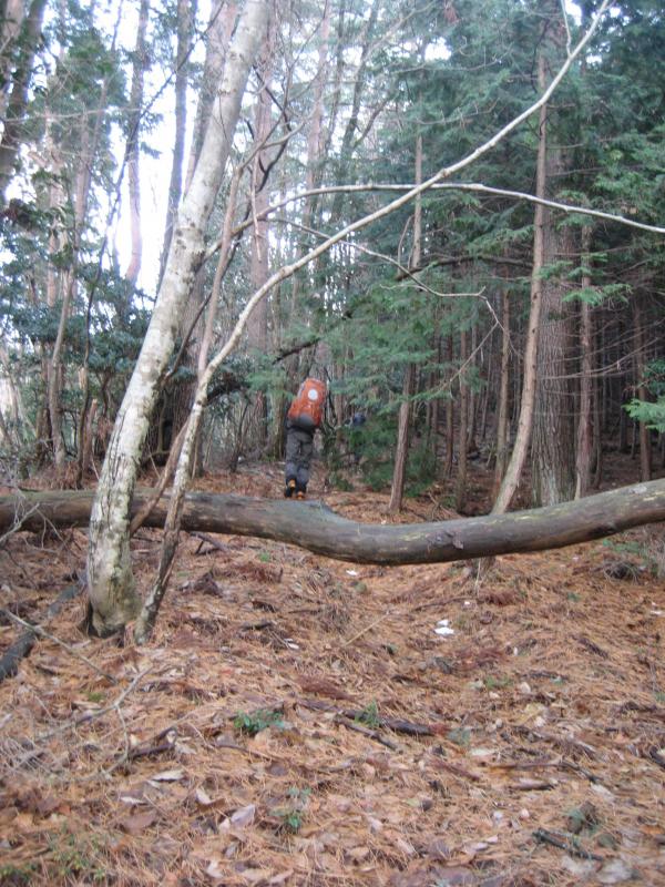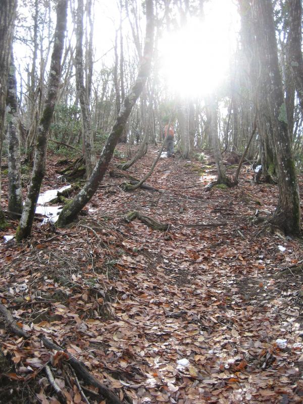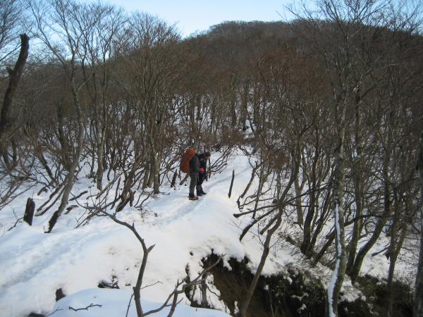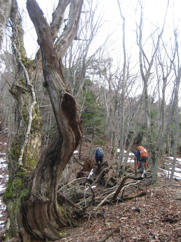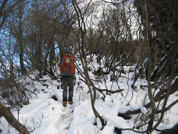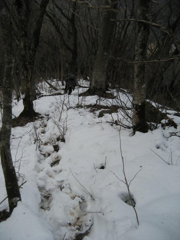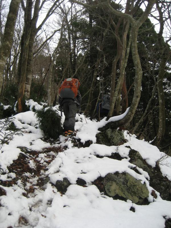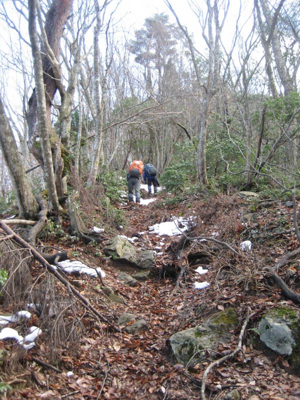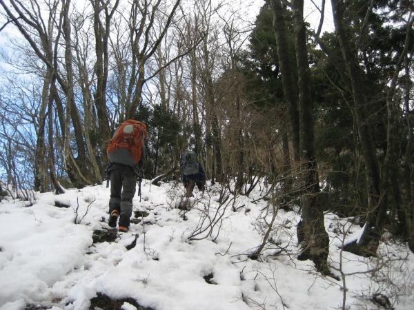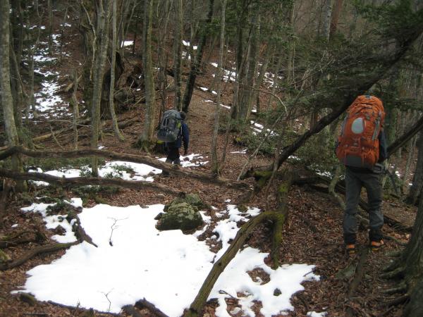 - 細川尾根は踏み跡ほとんど無し、急峻です。四日前に積もった雪が進路を阻む。