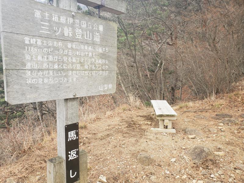 - 三つ峠駅―(30分)―三つ峠グリーンセンター―(60分)―達磨石―(35分)―又覗き―(20分)―馬返し―(45分)―八十八大師―(30分)―屏風岩―(20分)―三つ峠山荘―(15分)―開運山山頂―(40分)―八十八大師―(30分)―馬返し―(10分)―又覗き―(20分)―達磨石―(45分)―三つ峠グリーンセンター
