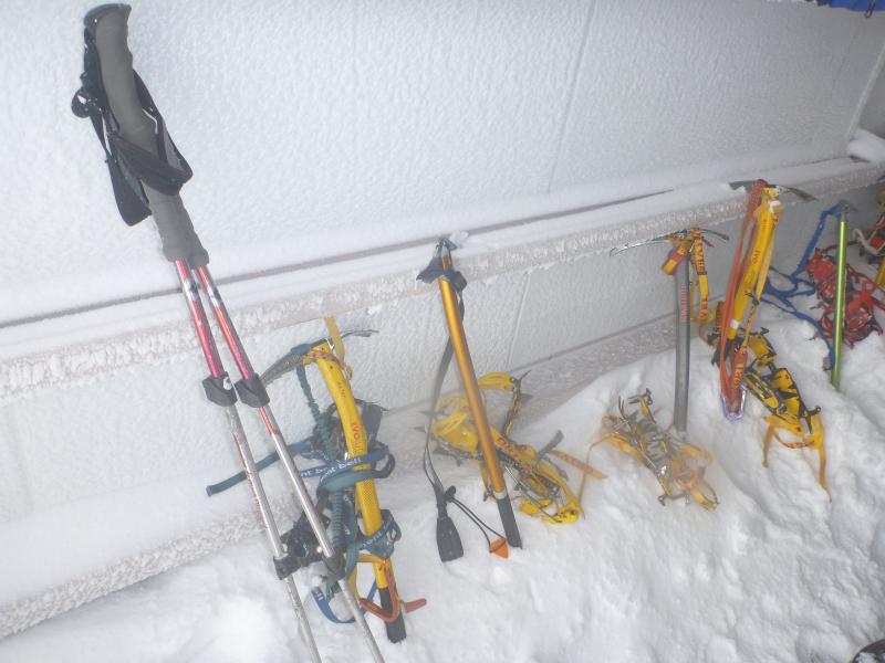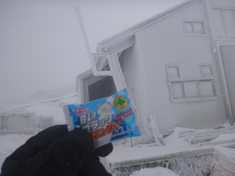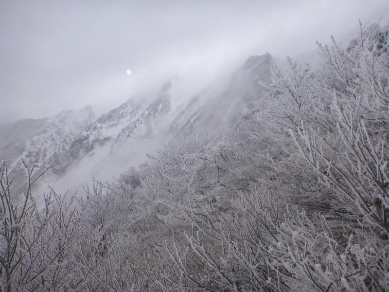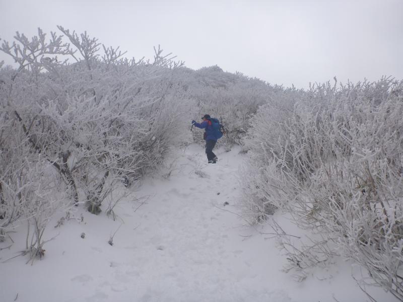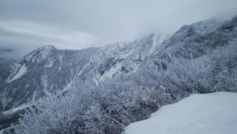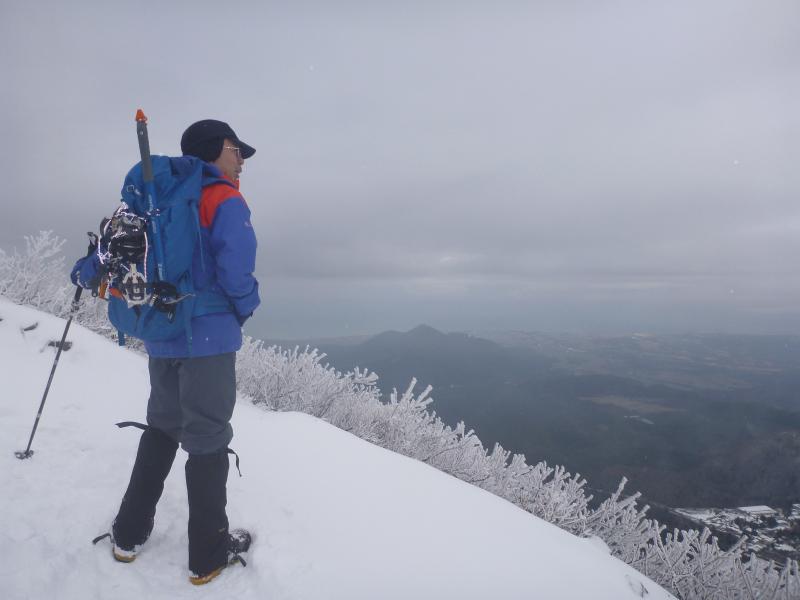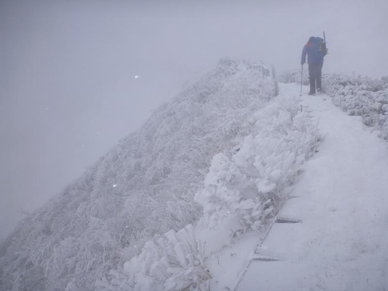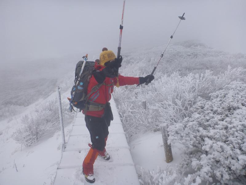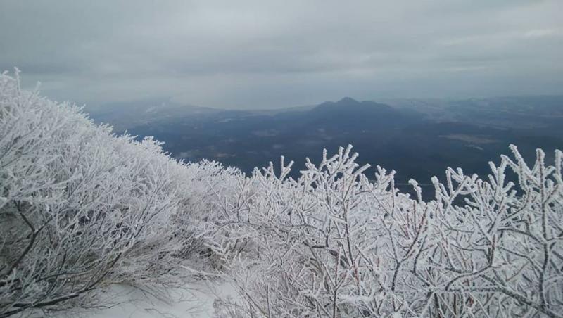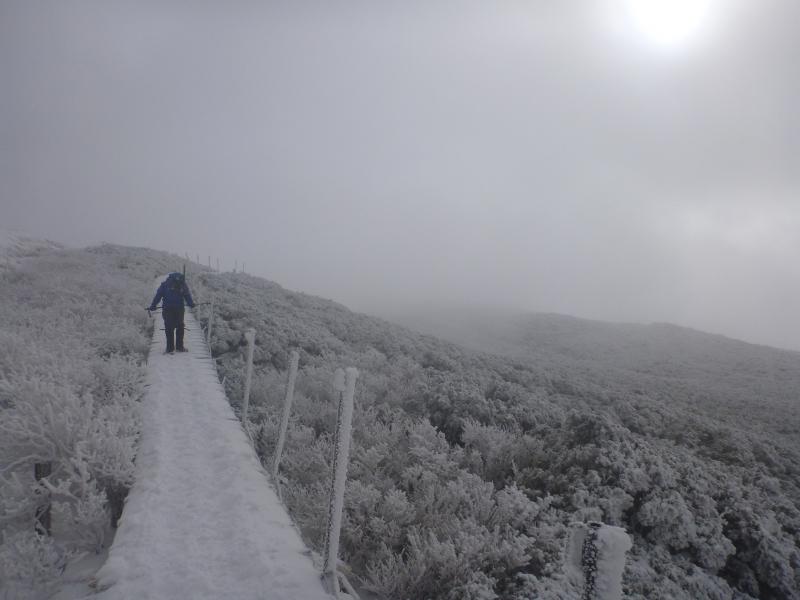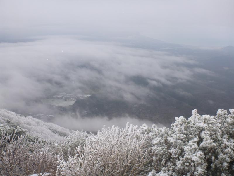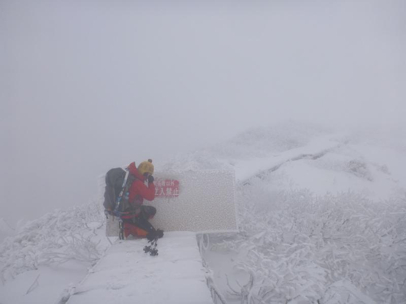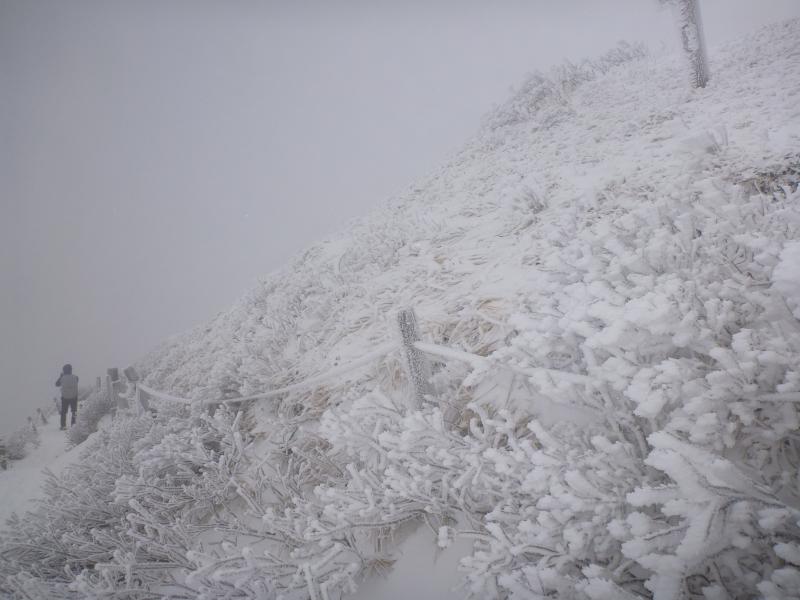 登りは、登山道がほぼ出ていたため、普段なら6合でアイゼンをつけますが、今回は付けず山頂に向かいました。8合にて、雲が晴れ、北壁と三鈷峰、弓ヶ浜など展望が開け、霧氷と一緒に絶景でした。カメラを取りに帰りたかったです。(笑)