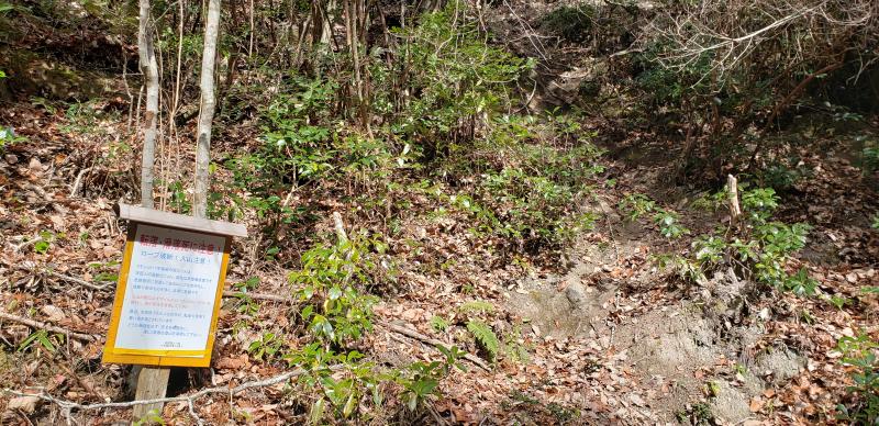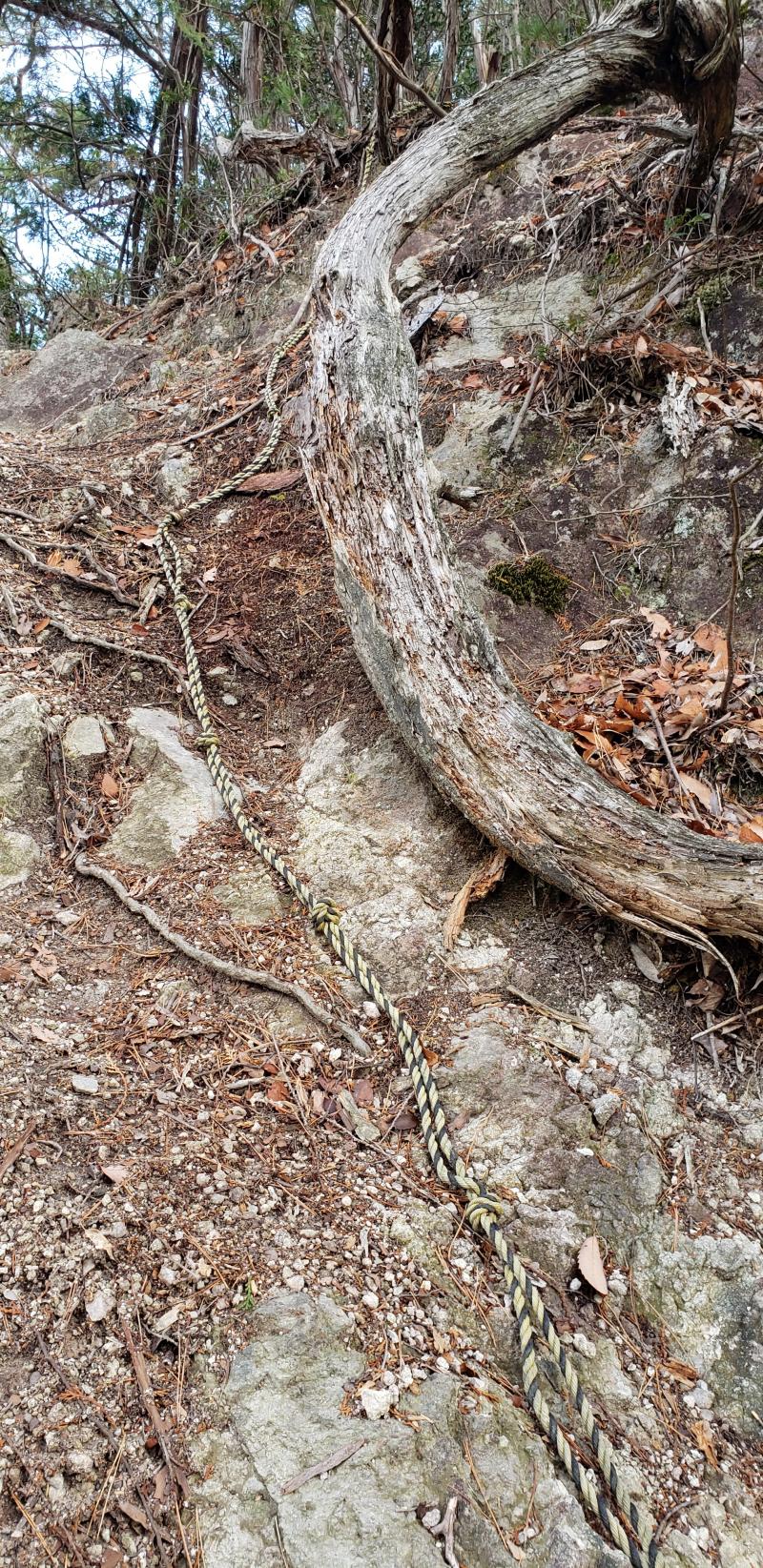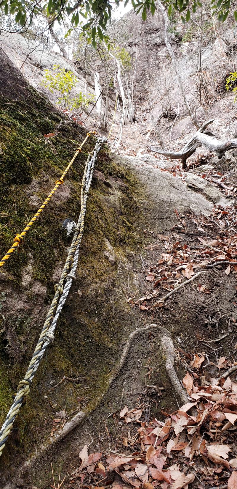 看板に記載があるように、道は人が入っていない事も有り荒れています。またところどころトラロープが張られていますが、表面は毛羽立っており、とても体重を載せることは出来ない物です。