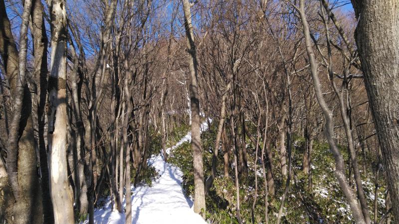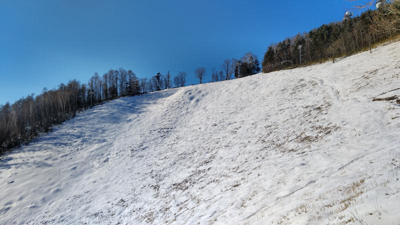 雪が少なく、登山道脇は笹がかなり見えてます。途中で横を通るスキー場のコースもまだ草が所々見えている状態。当然まだここはオープンしてません。(下部のコースのみオープン)