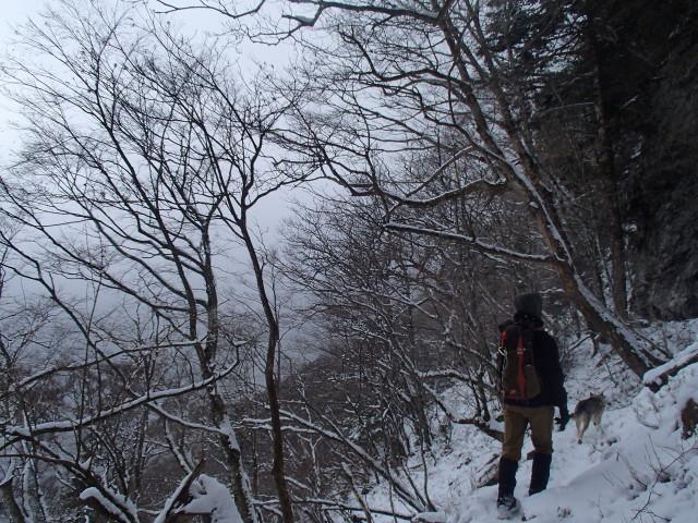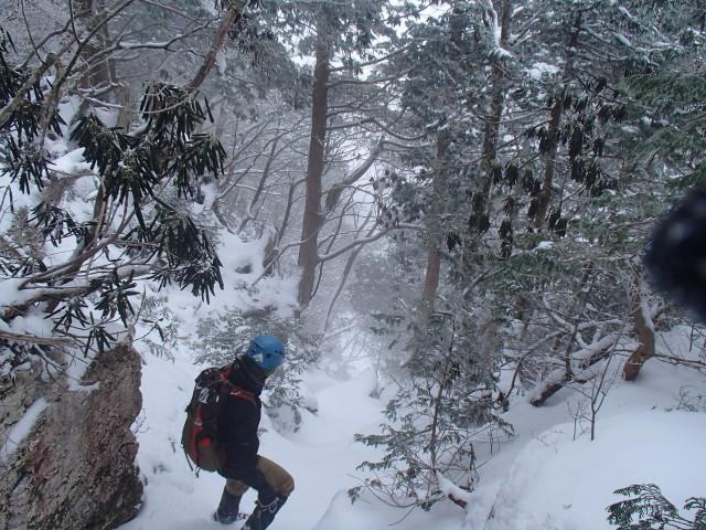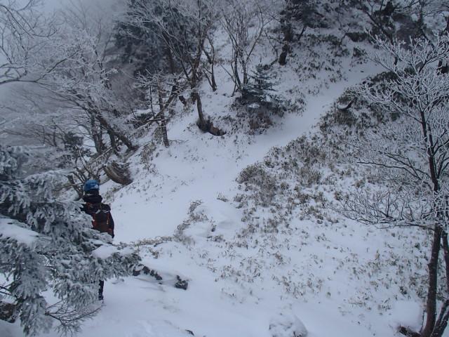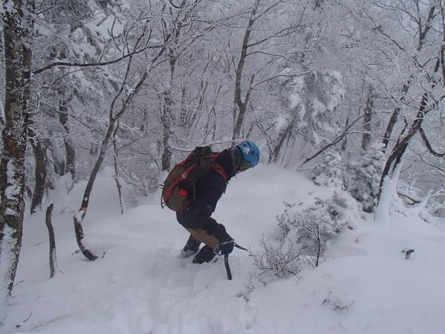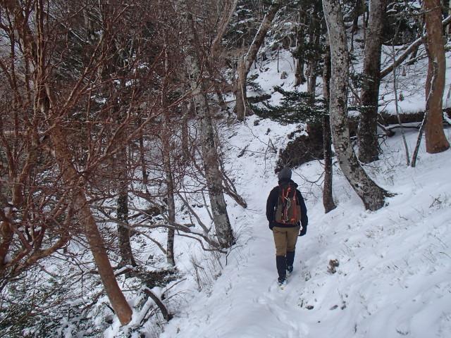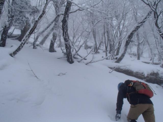 新雪の下には石や木が隠れておりバランスを崩しやすい。アイゼンの歩行にある程度なれないと転倒して谷底に滑落する危険があり。