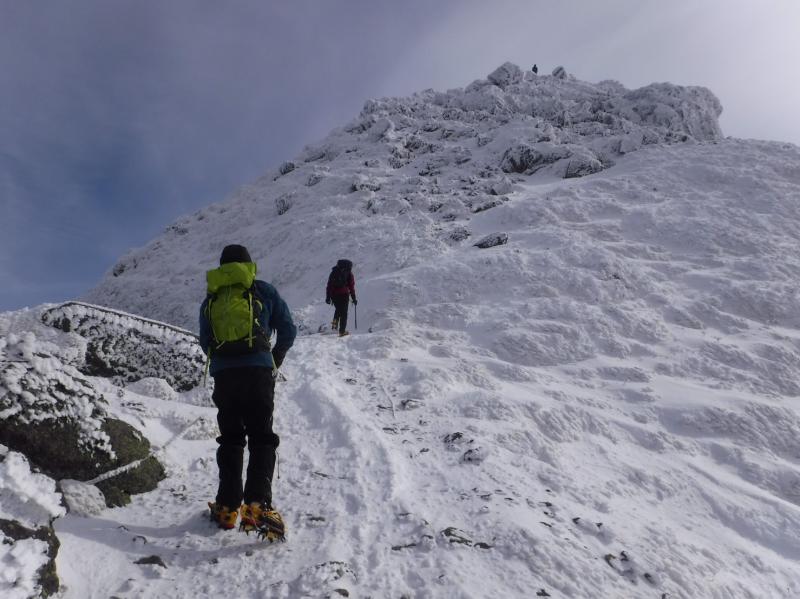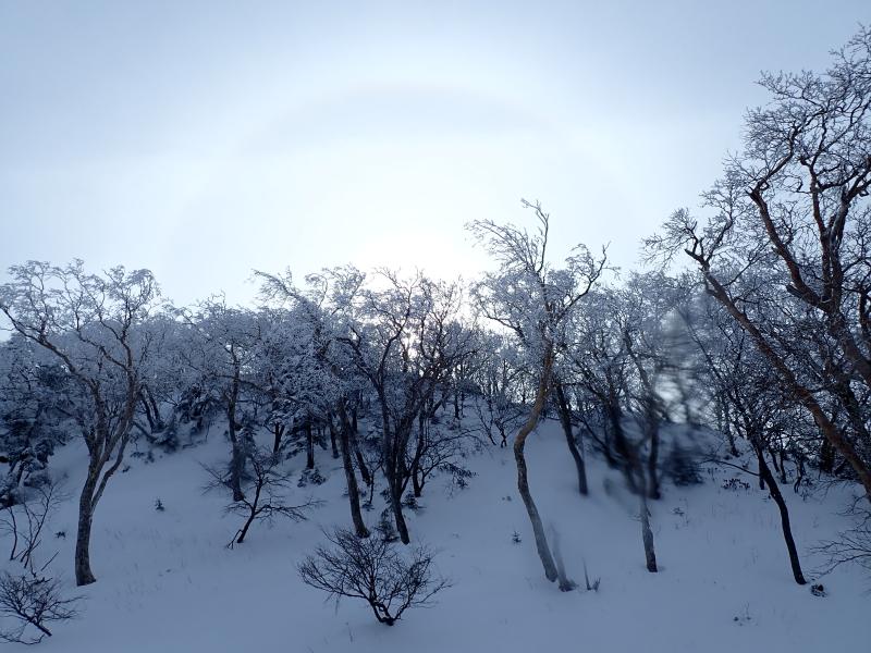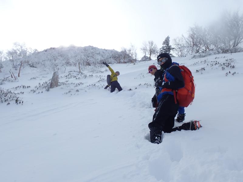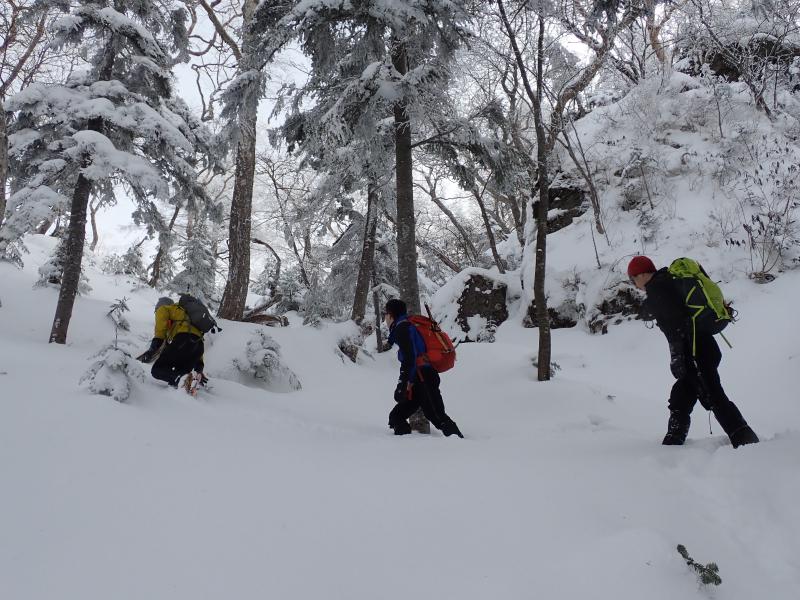 アイゼンは最初からつけて登る、樹林帯近くでスノーシューを楽しむ方もいた。