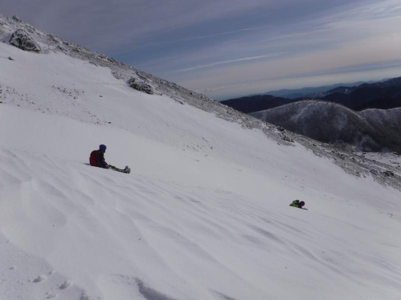 景色を堪能しながら下山へ、素敵な斜面があったので尻セードで時間を巻く。