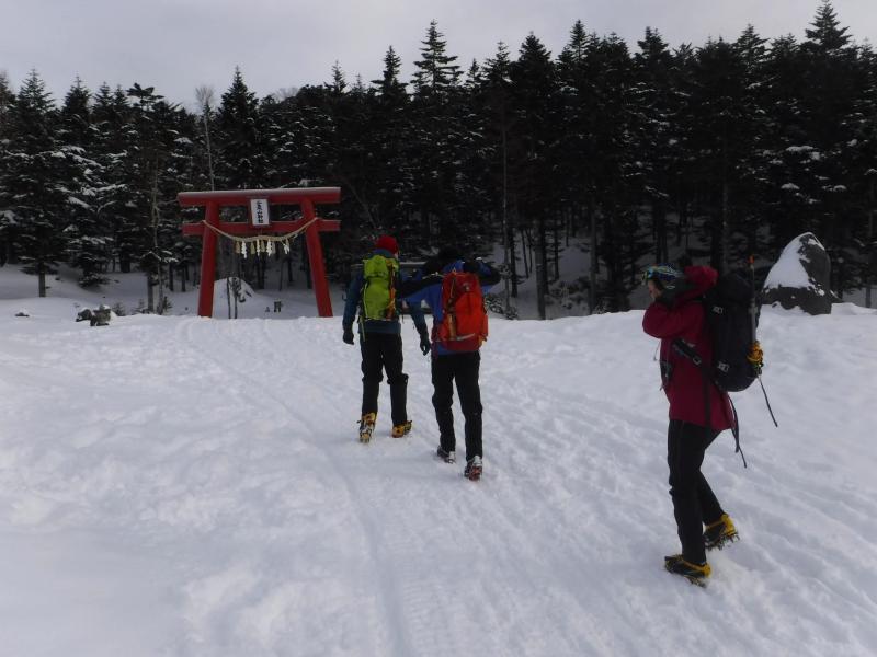 鳥居をくぐり樹林帯に入るとうっすらトレース。踏み跡に10cmくらい雪がのっている感じ。