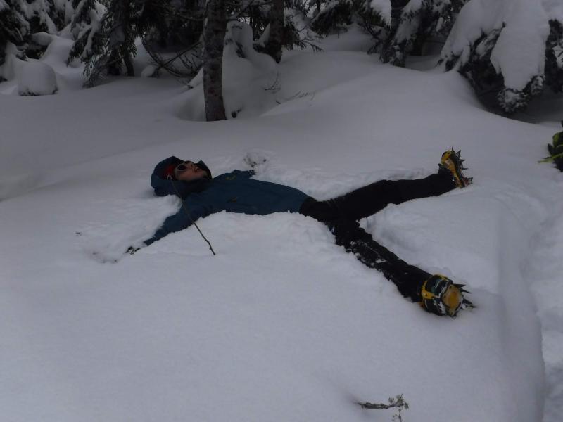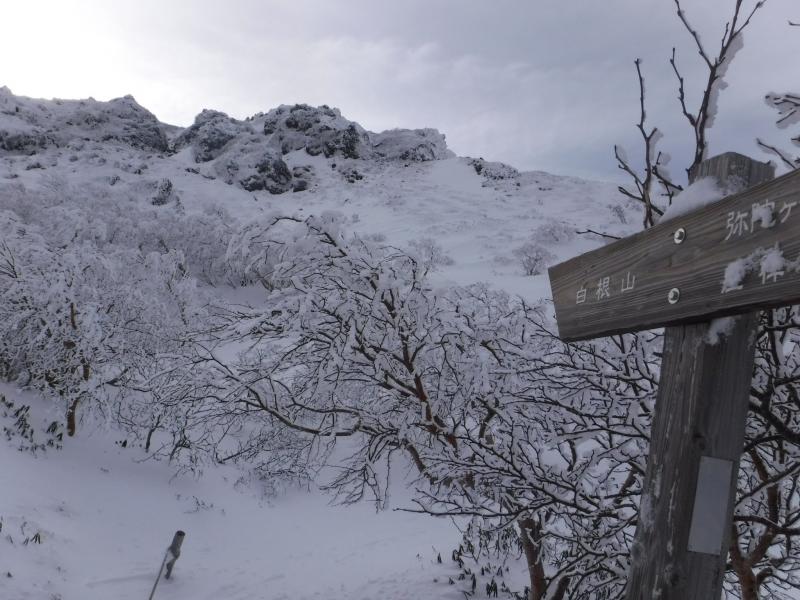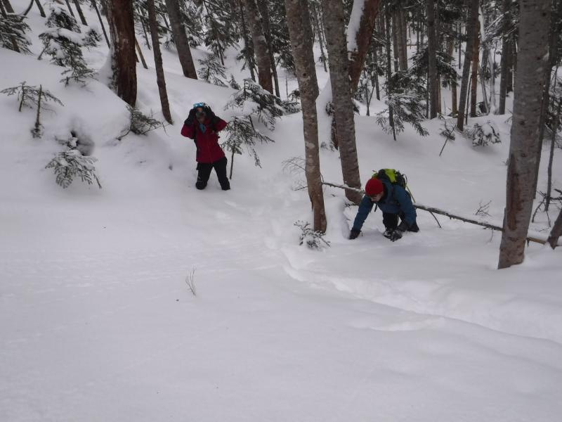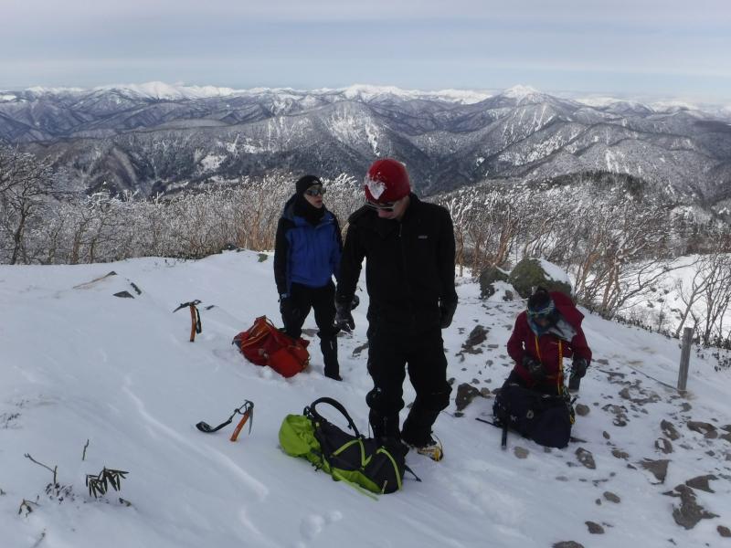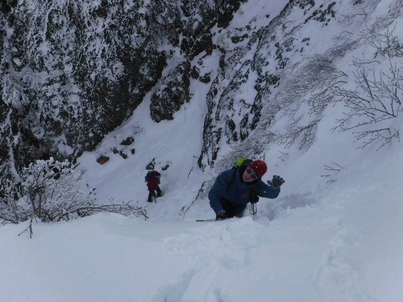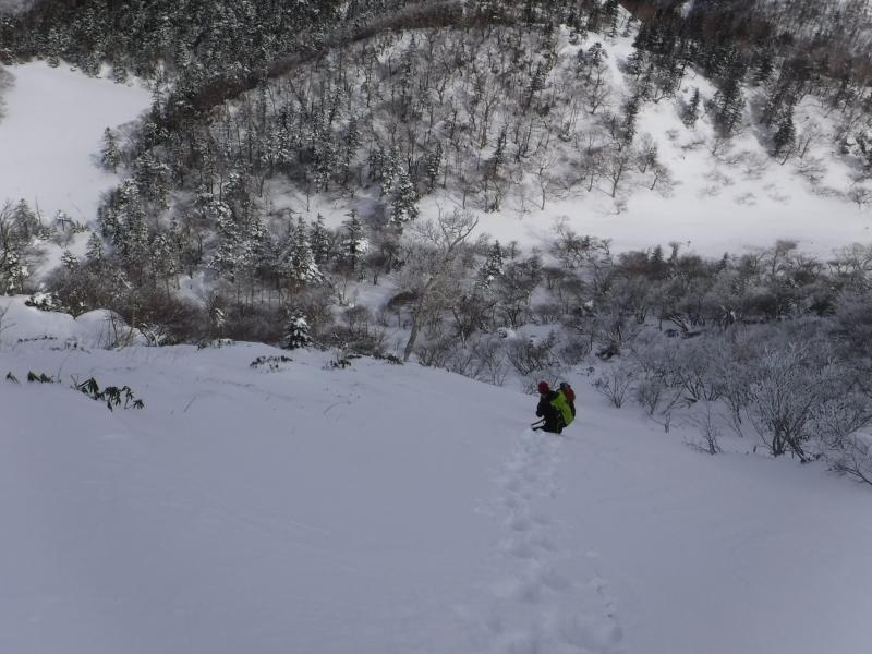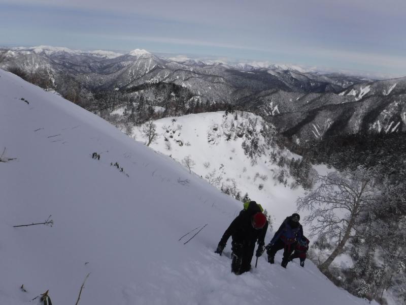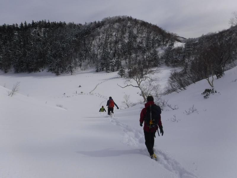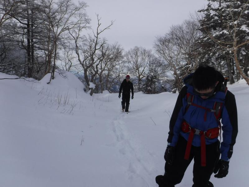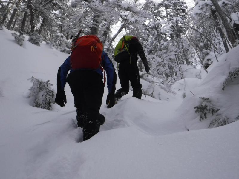 樹林帯の急坂ラッセル、雪の草原、上部の岩場…