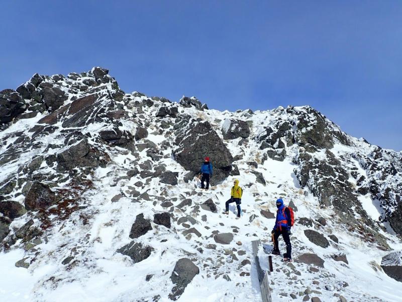 尾根は岩場が多い。雪がそんなについてなかったのでペンキマークとロープが見えた。