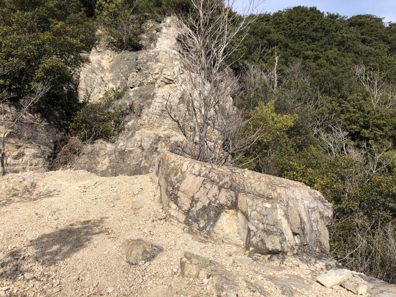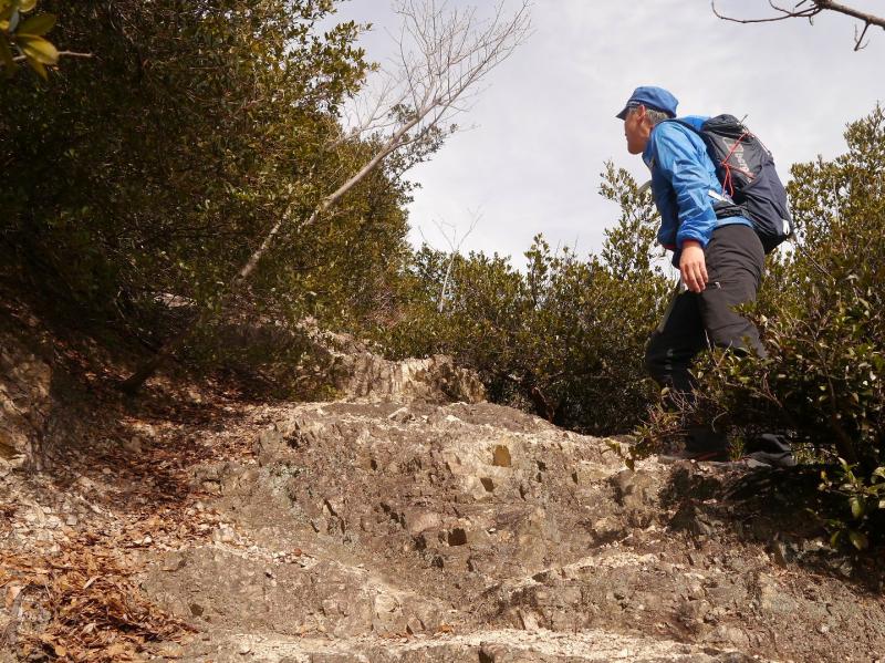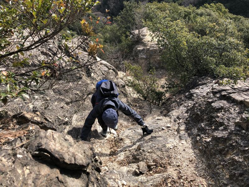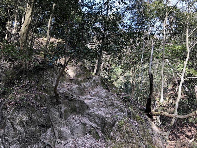 - ・名水の森入口から左の登山道を10分ほどの分岐で左右どちらにも行かず道標のない中央の尾根を登ります。アップダウンを繰り返しながら徐々に高度を上げていくと縦走路に出会う直前に岩場がありますがここは迂回路もあります。