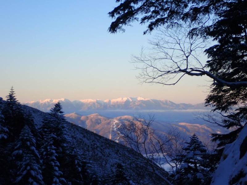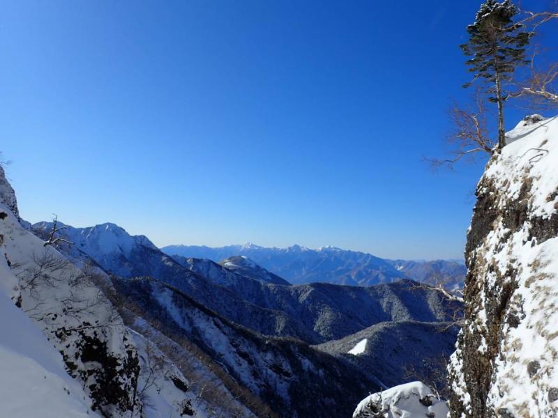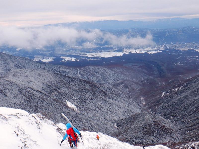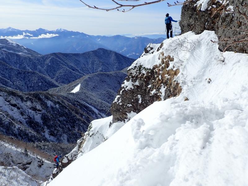 立った岩の上は、傾斜のある雪稜にところどころ凍った草付が混じっており、全くランナーが取れない状況で30m以上ロープを伸ばしました。
