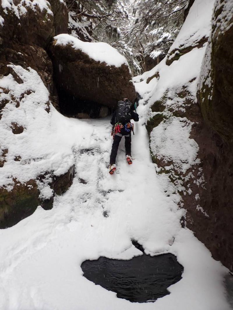 沢の踏み抜きに注意しながら、詰めていくと、すぐに小さな滝が連続して出てきました。