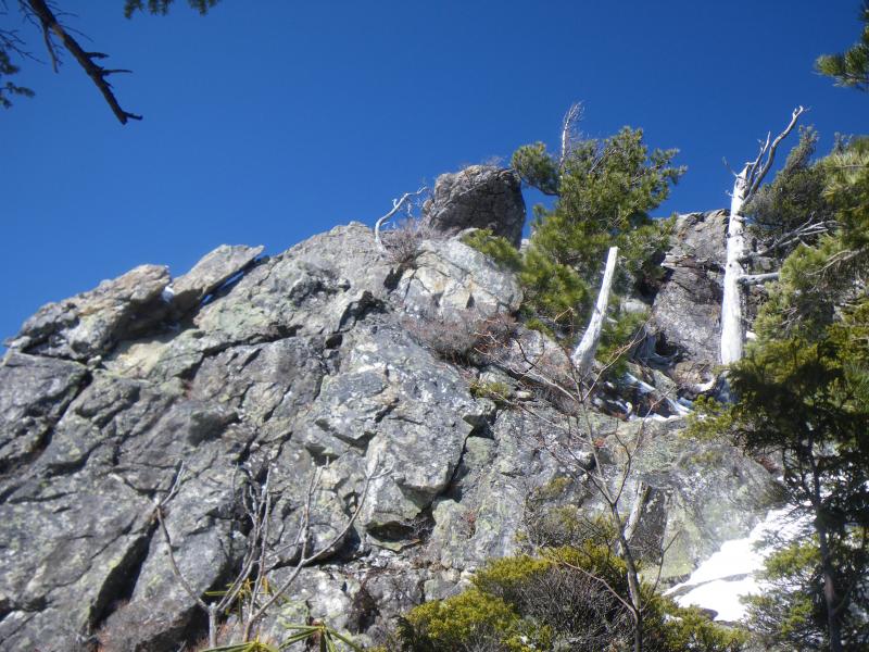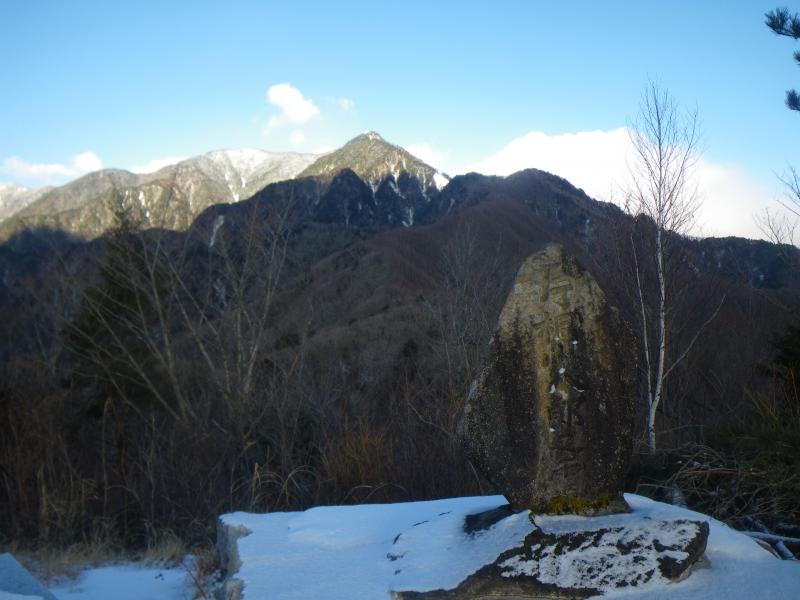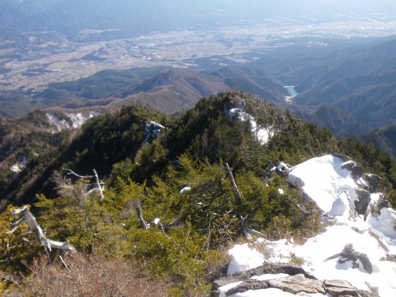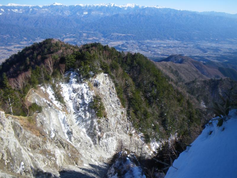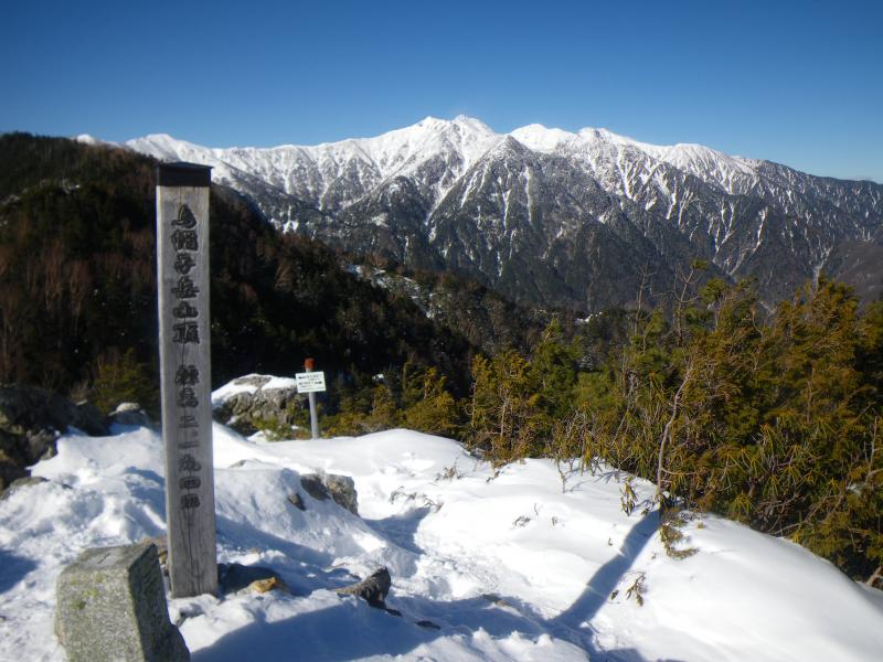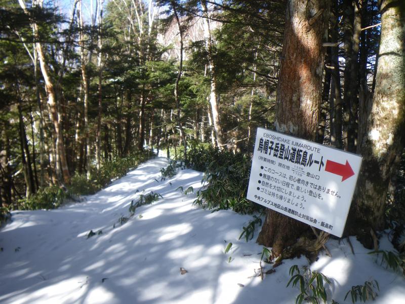松川町の鳩打峠から登山道が通じ、烏帽子岳の先、念丈岳まで続きますが最も手前の小八郎岳(1470m・こはちろうだけ)は片桐郷の豪族、片桐小八郎の名からきているそうで、南アルプスが一望できる最高のロケーションでこの山までならすぐに来れそうな身近な山ですが、その先の烏帽子岳までは鳩打峠から1000m、小八郎岳からでも700mの標高差があり、なかなか険しい山です。雪を求めて、この山を選びましたが、小八郎岳に最後に上がる階段部分までほぼ雪はなく、山頂から下る時にやや困るくらいの雪の量でした。小八郎岳は南アルプスの展望台ですが、朝は逆光になるので午後からがベストだと思います。またこれから登る烏帽子岳も見えますが、いかに遠いかもわかります。7/10の飯島分岐まで快適な尾根歩きです、順調に進みましたが、この先のセオナギのトラバースでだんだん細い尾根に変わり、樹林帯の急な坂に変わります。8/10から小さな岩峰が多くなり、鎖のあるトラバ-ス道などで思っているより時間が掛かり、しんどい時間帯です。最後の烏帽子岩は岩場を超える上級と岩場を梯子階段で巻いていく道に分かれます。今日は岩場に雪もなく、いいアイゼントレーニングになるということで上級コースに進みました。短いですが、背後が南アルプスで傾斜もそれほどないので面白みがありました。帰りは初級コースで行きましたが、こちらは梯子階段も9割がた埋まっていて、急なルンゼのような感じになっていて、岩に雪がないなら登りはかえって上級コースの方が楽ではないかと思いました。