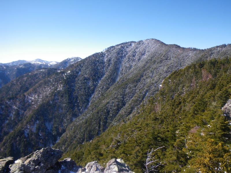 最初の目標はこの先の念丈岳でしたが、到着が12時前になり、この先は危険箇所はなくても樹林帯の中で時間がかかりそうです。山頂から見えているのがまだ手前の池の平山なので、やはり遠すぎました。