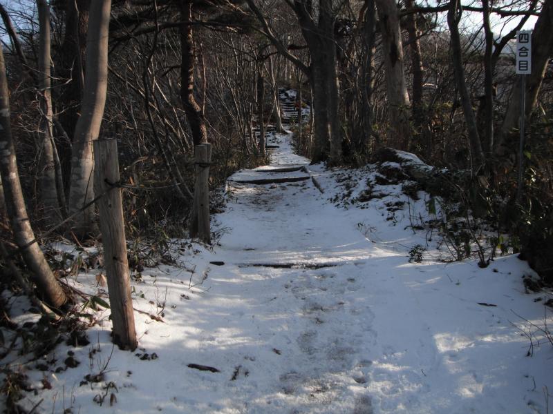 三ノ峰でワカンを外し、よく踏まれた雪道をキックステップで慎重に下って行きます。四合目からはぬかるみに変わり登山口へ帰還。
