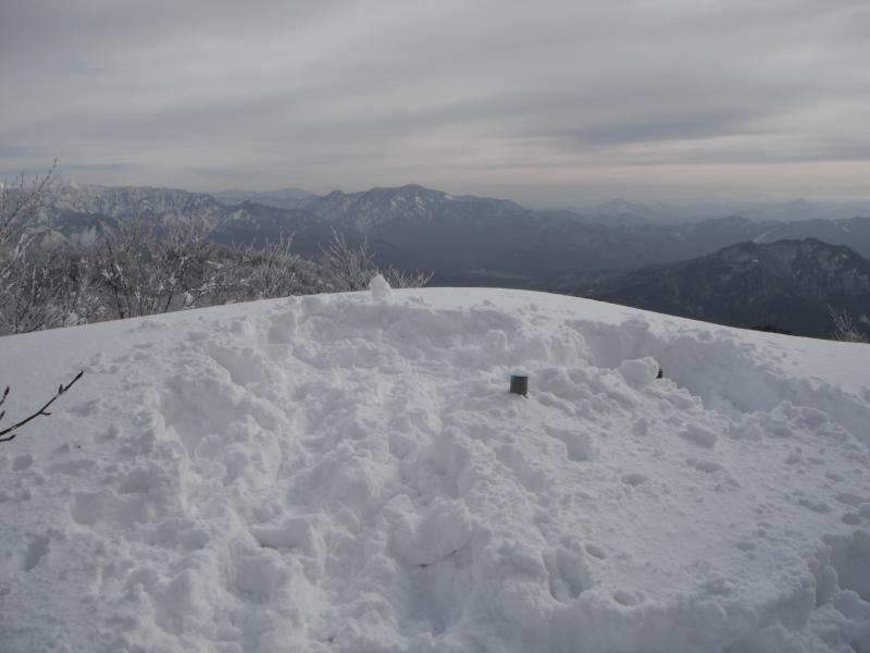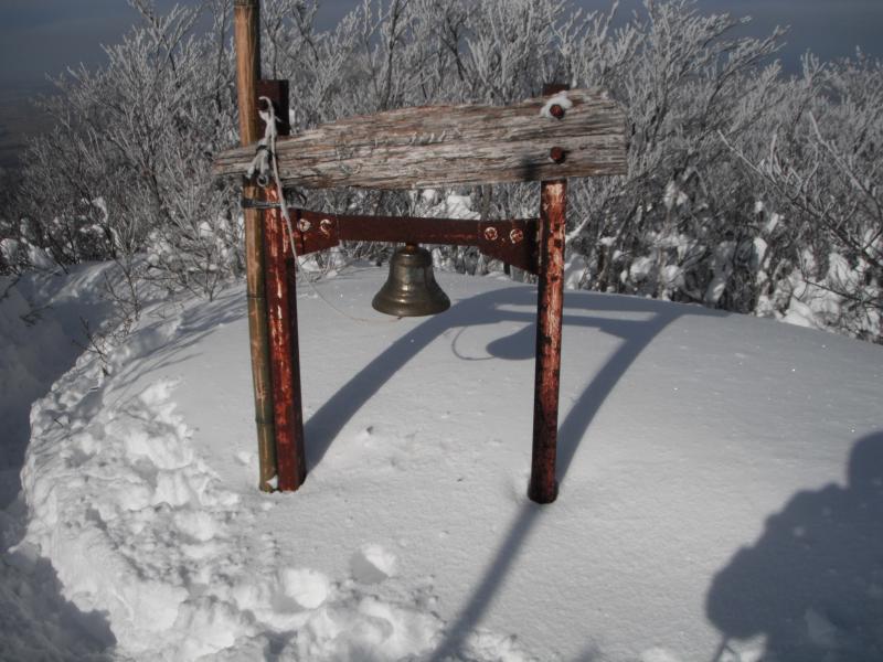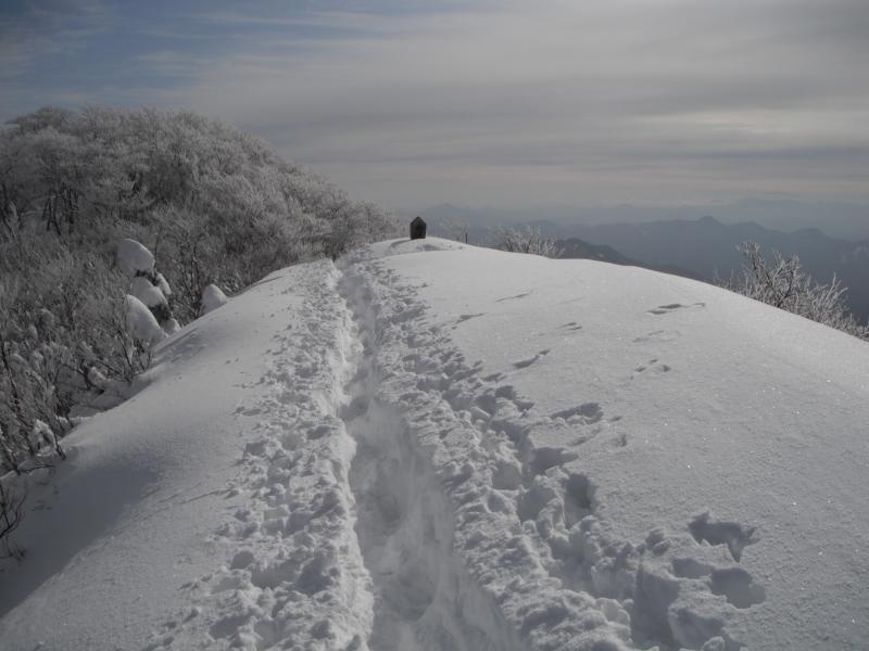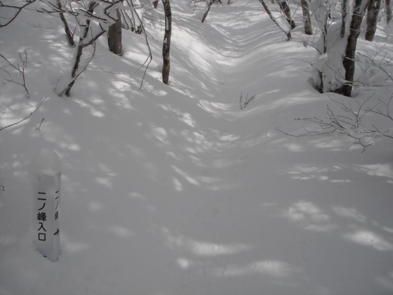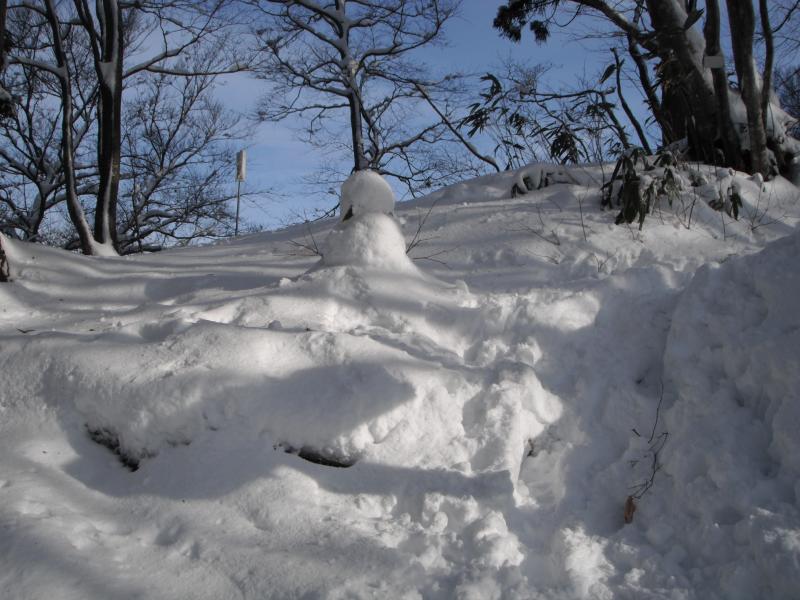 さて帰りますか。二ノ峰の分岐まで戻ってくると、むむ!まだトレースが付いていない!?いいんですか?トレース付けちゃいますよ?本当にいいんですね?!周りに誰もいないので不肖私めがトレースをつけさせていただきます!………。本当にいいんですか?!早く行け!と一人芝居をしつつ、雪がなければ数分のところを15分くらいかけてラッセル!たどり着いた二ノ峰では頭だけでていた薬師様が待っていてくださいました。