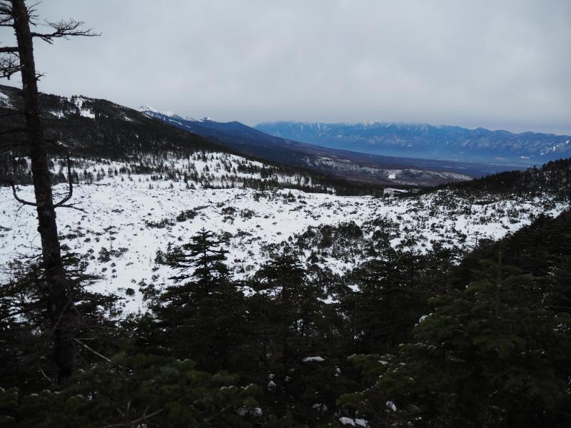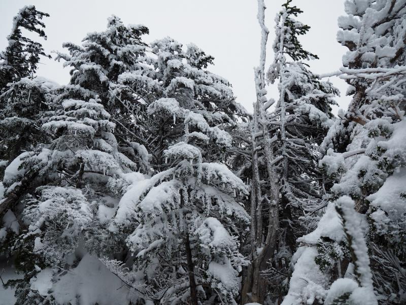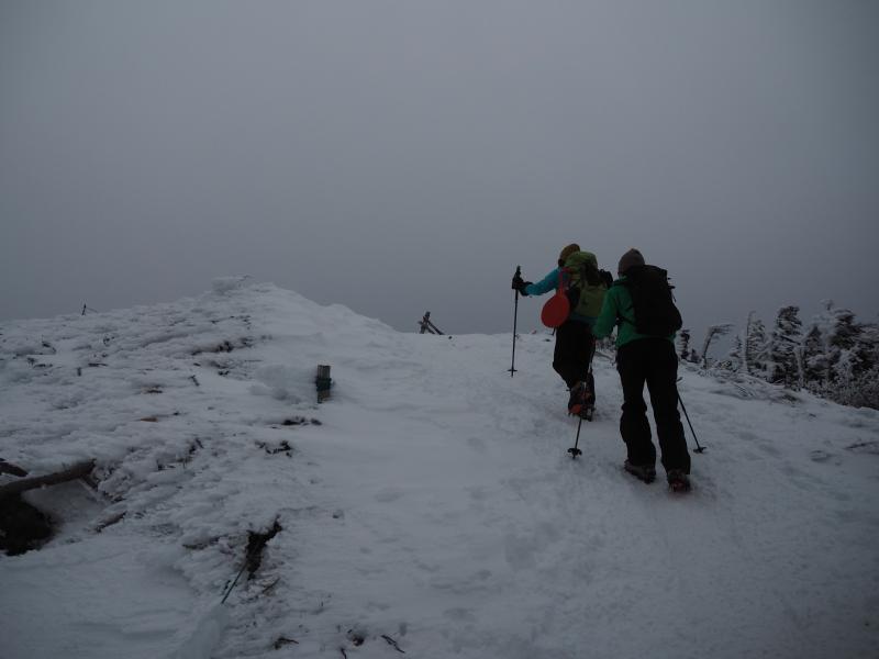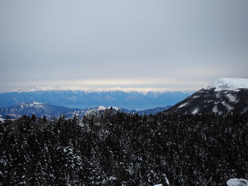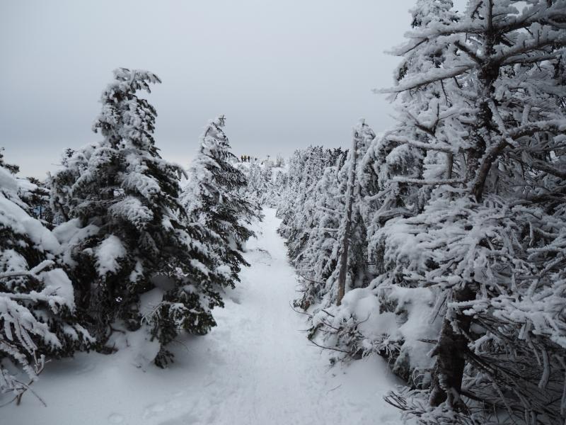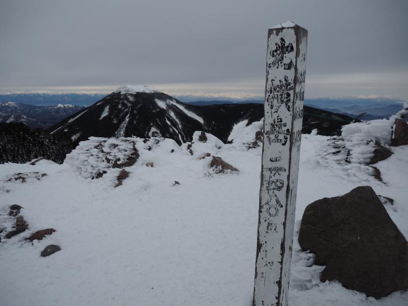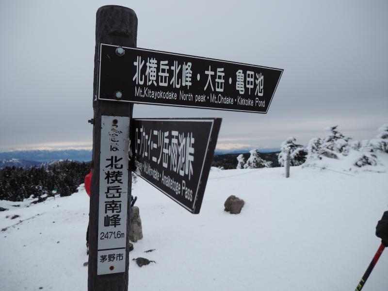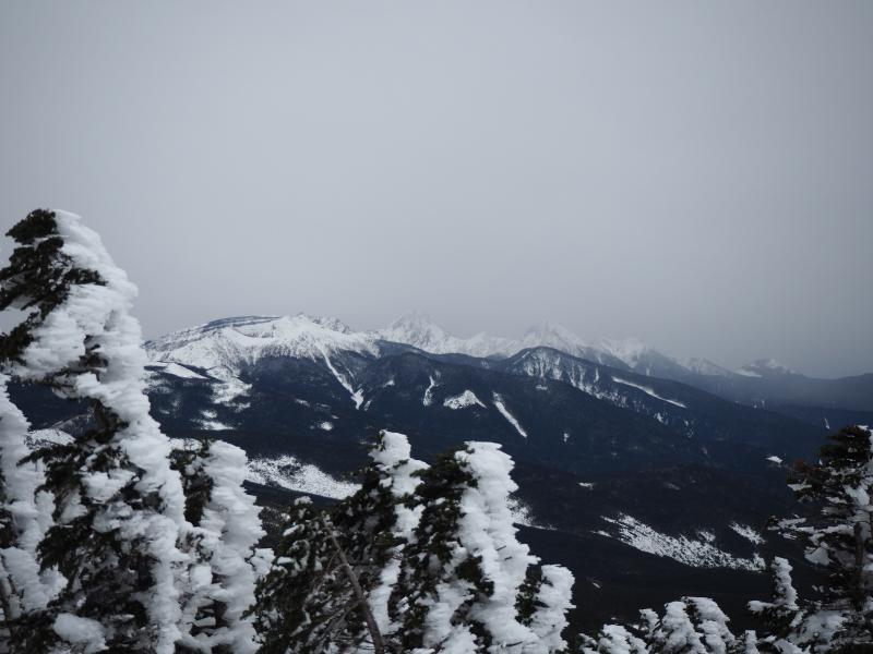それでも北横岳ヒュッテを過ぎると次第に雪量が増えてきて、霧氷も出てきました。雪山に来た感アップアップ。初心者アルバイトさんもテンションアップアップ。辿り着いた山頂からは正面に蓼科山がくっきりと。遠くには北アルプスの山々も見えます。今日は残念ながら曇り空でしたが風が弱く山頂でゆっくりと展望を楽しむことができました。