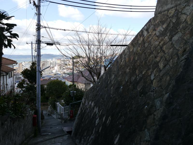 塩屋駅から線路高架に平行する路地を東へ、すぐに住宅街の急な登りを進み登山道に入りります。