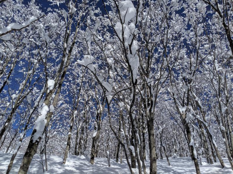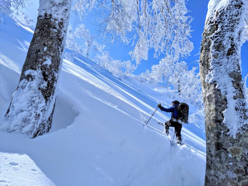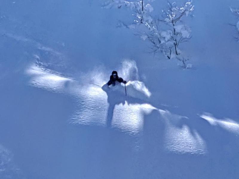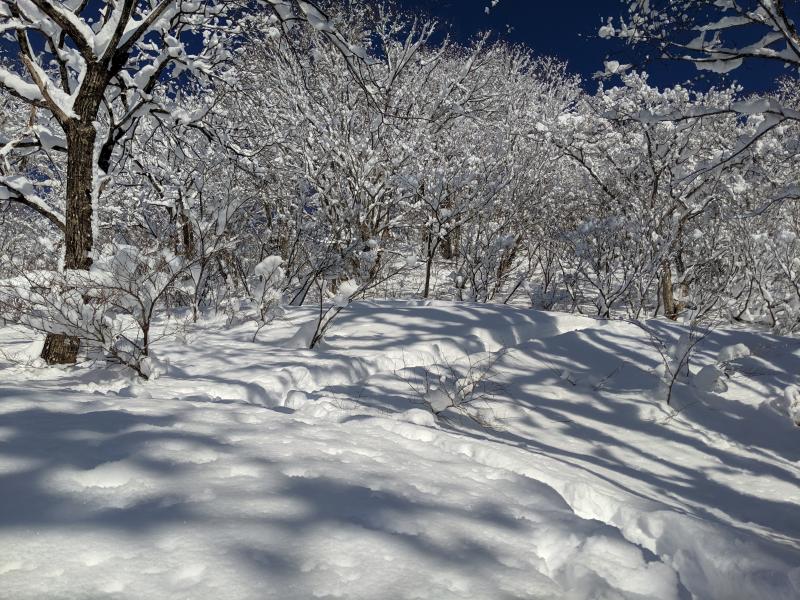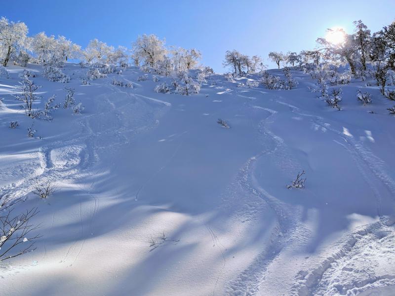 南面は山頂へ着く頃には重くなり始めていましたが、北面はドライ。抵抗の無い非常に軽い雪で今季一のパウダーでした。