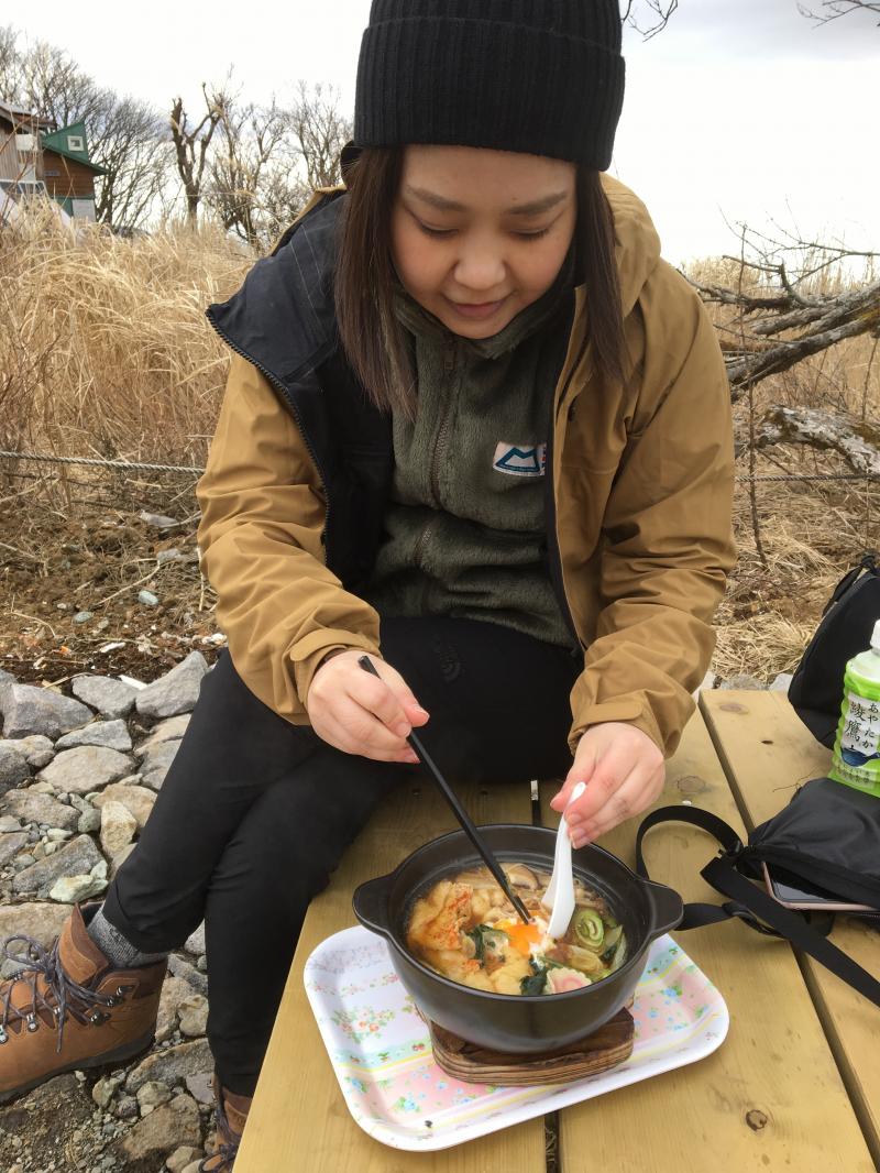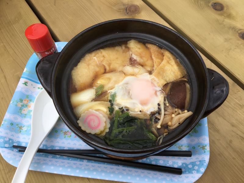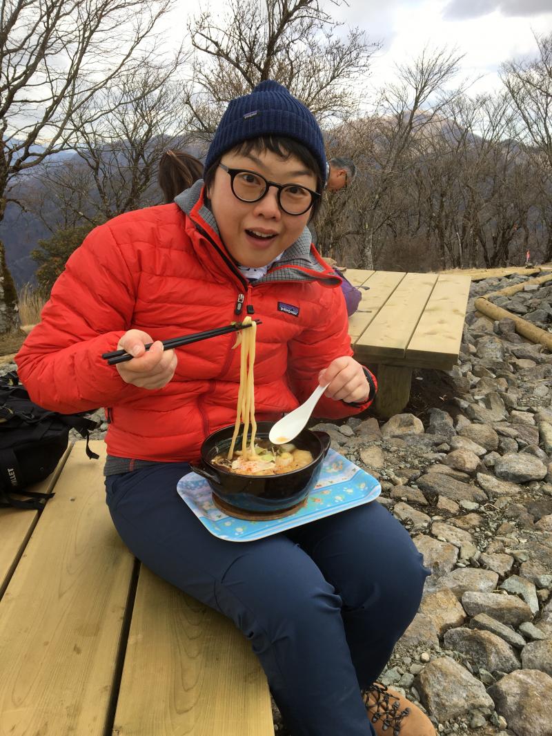 そんな平木さんを後ろから「がんばれ」とか「うどん」とか言いながら2人で地味に登り続け、予定通り11時40分頃山頂に到着。売り切れる前にとすぐに山荘に行って鍋焼きうどんをふたつ注文し、ぐつぐつ煮え立ったうどんが出てきたときは「おいしそう!!」と思わず言ってしまいました。