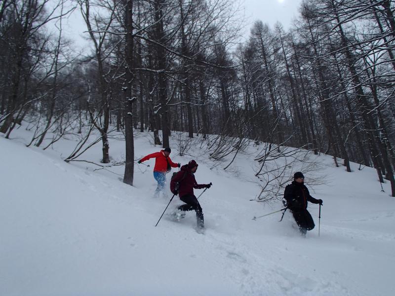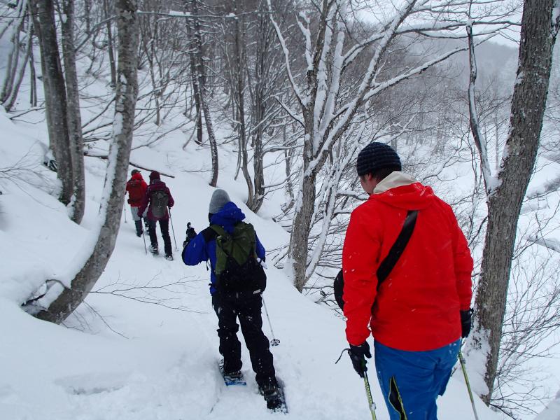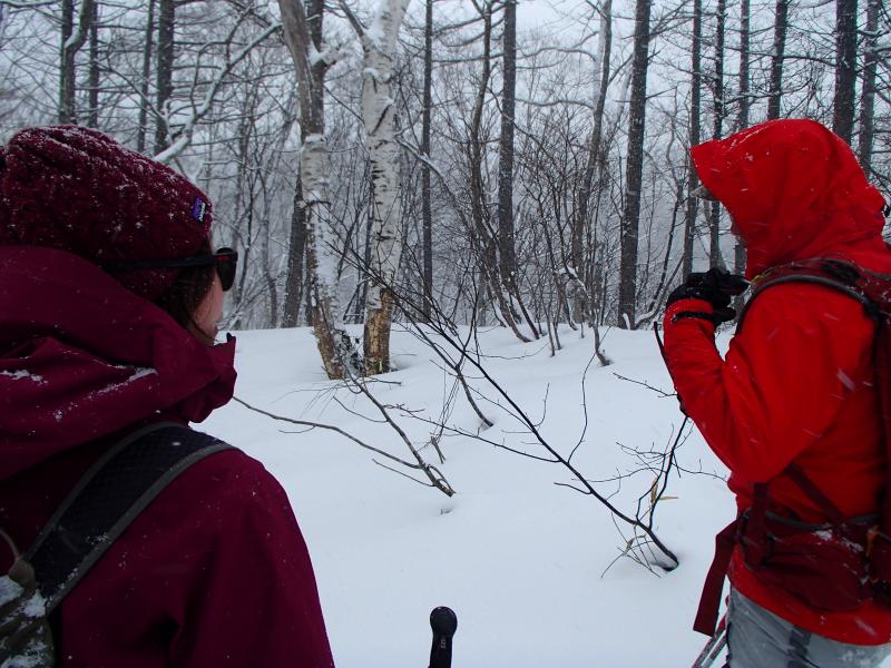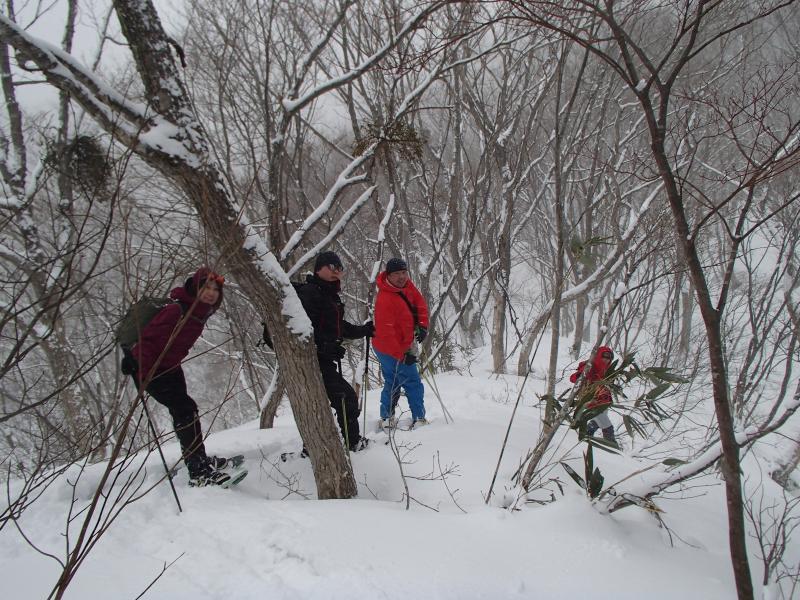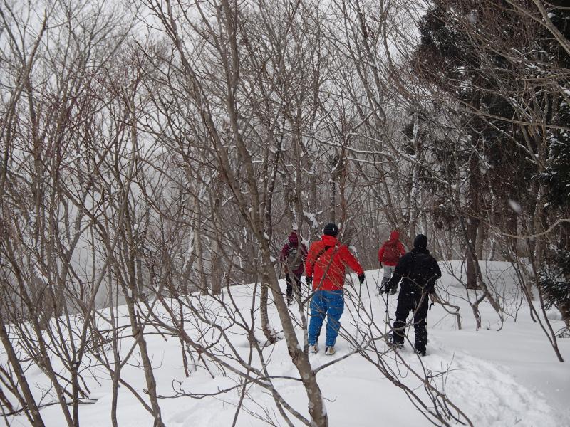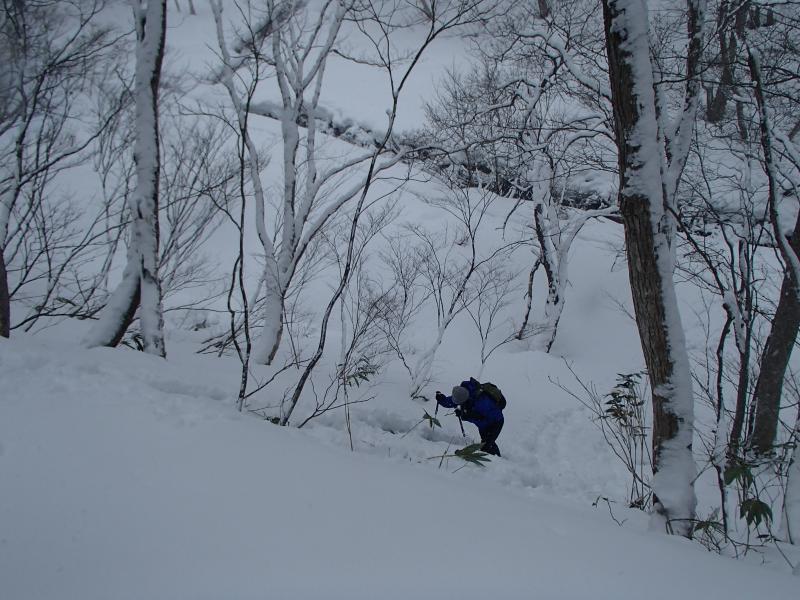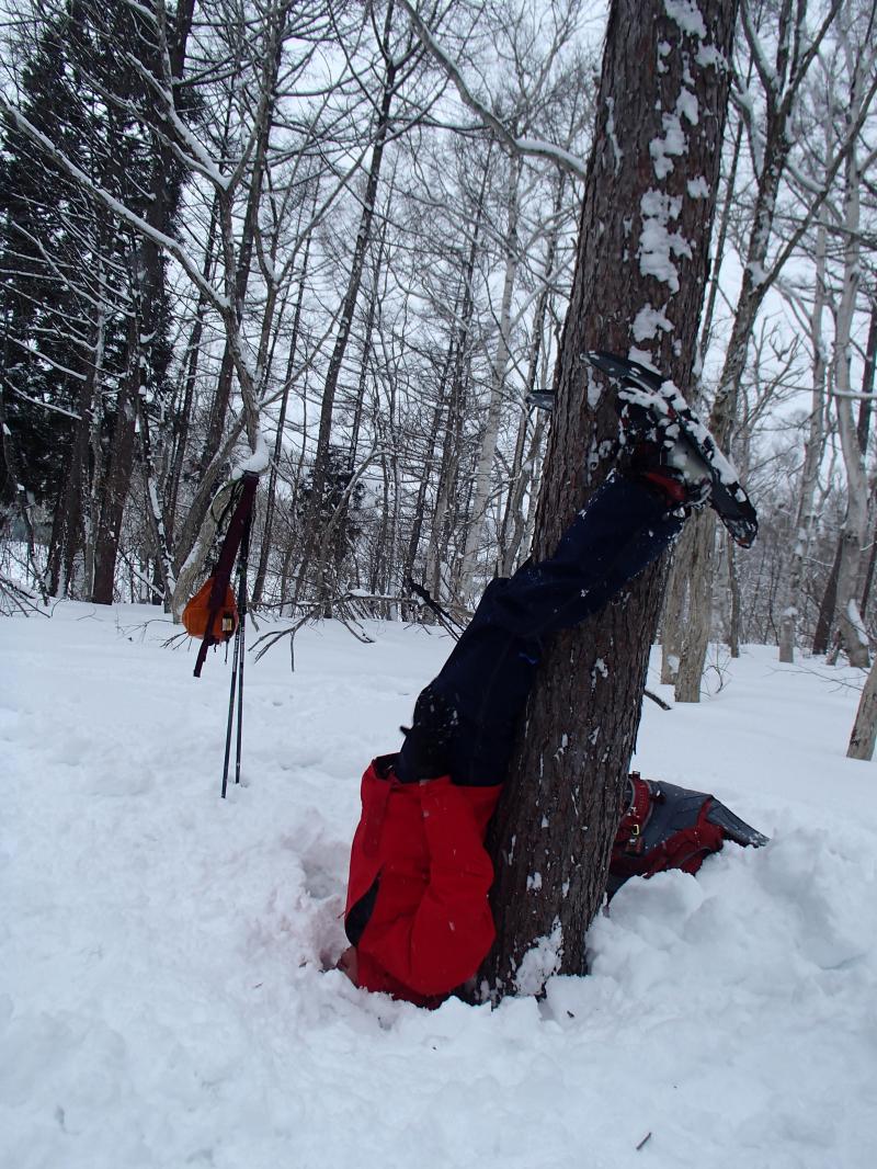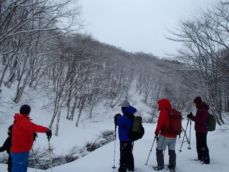 ・やや開けた場所に出たところで問題発生。前方の沢周辺の雪が少なく、通過できるかどうかとの事。こんな時に役立つ生贄はワタクシしかおりません。率先して通過に挑みます。有難い事に結構太い木の枝があり、難なく通過できました。