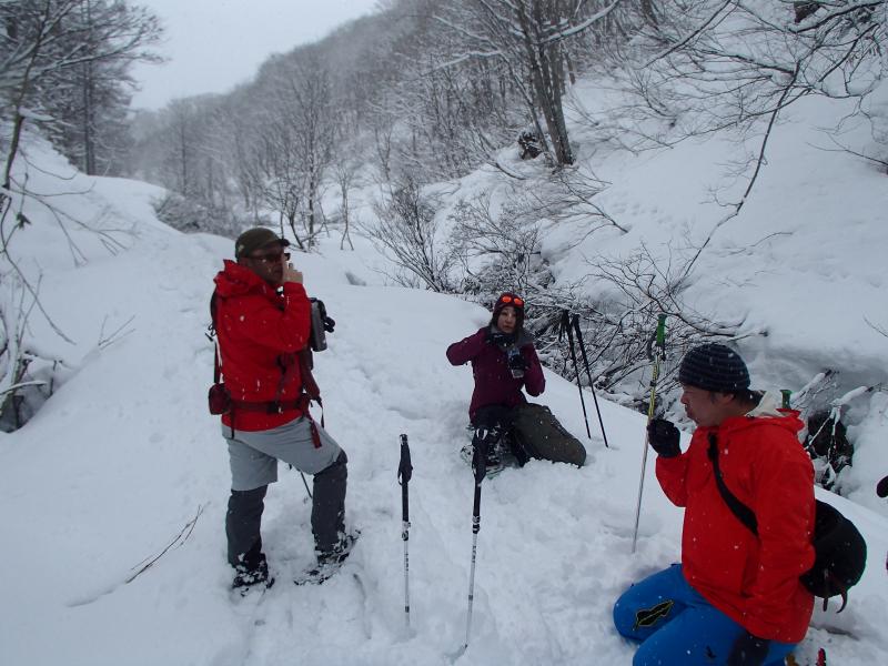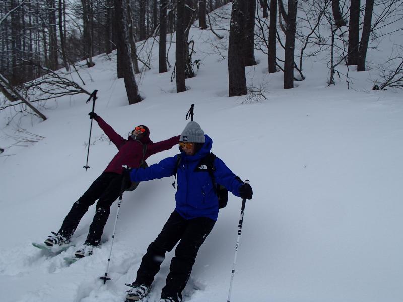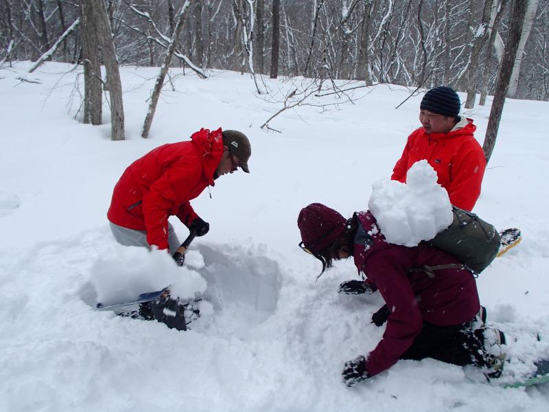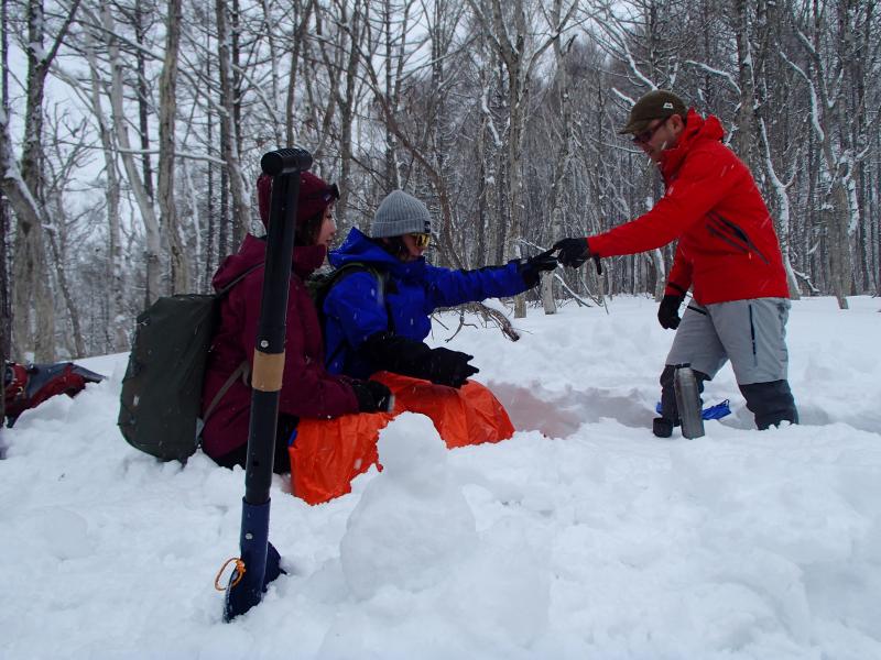 ・樹林帯まで戻った所でやや時間的に余裕が出来たのか、メンバーの希望に沿ってリーダーがショベルを巧みに使い、雪のテーブル&チェアーを作成。一旦ほっこりタイムに(リーダー&女子メンバーだけ)。後のメンバーは雪合戦や、頭から雪面に突き刺さったりと好き勝手やっておりました。