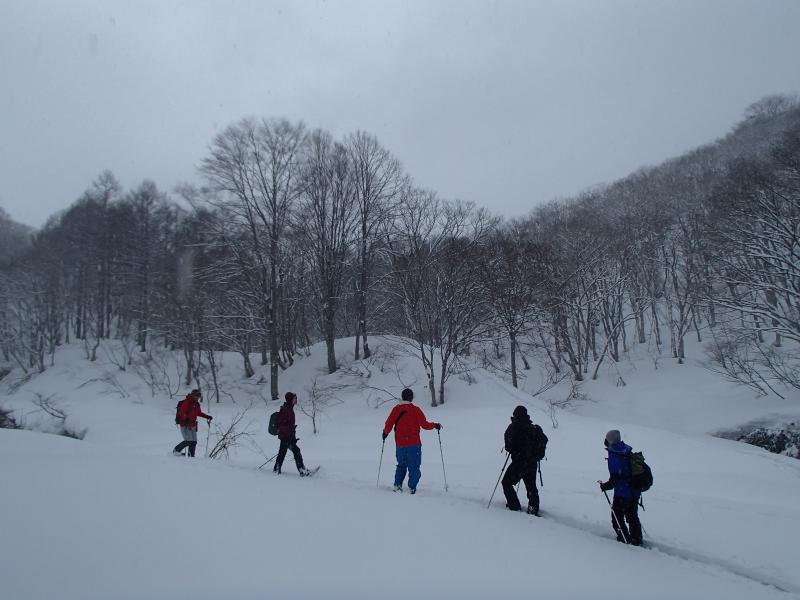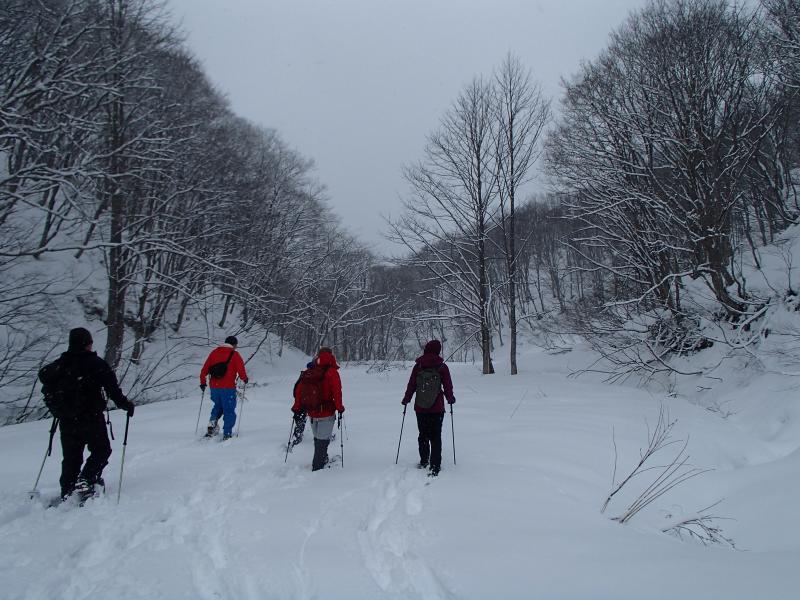 ・曇天、風はやや強め。コンディションはあまり良くないものの若手メンバーは元気いっぱい!道路脇から入山し、スノーシューウォークスタート。