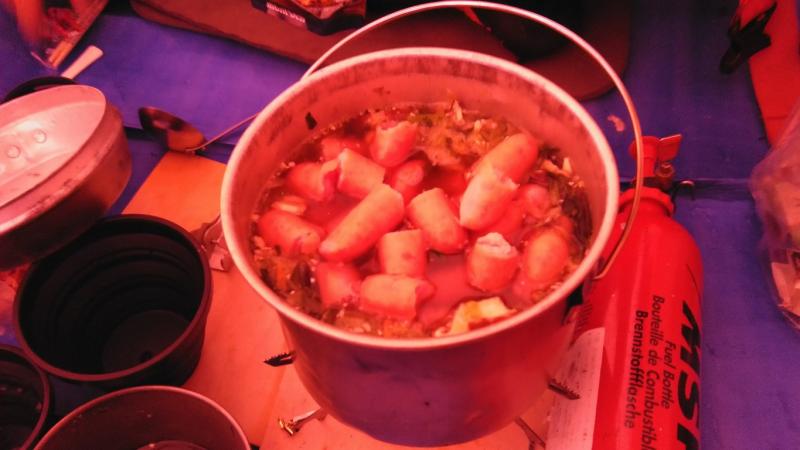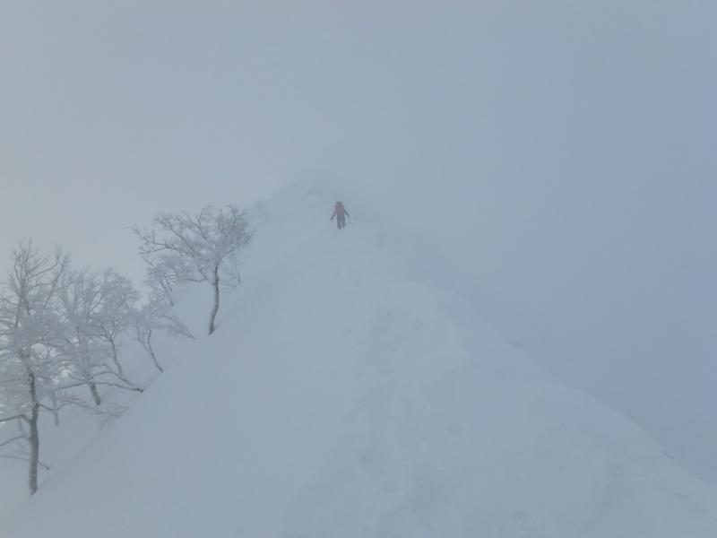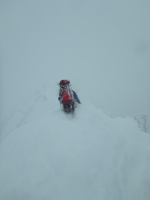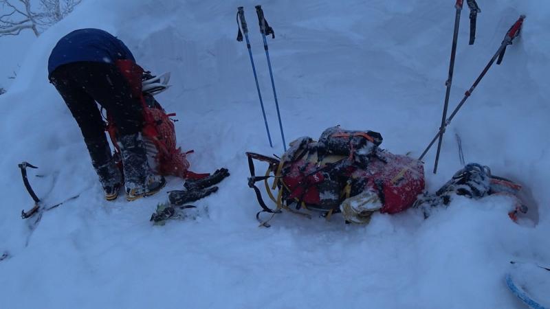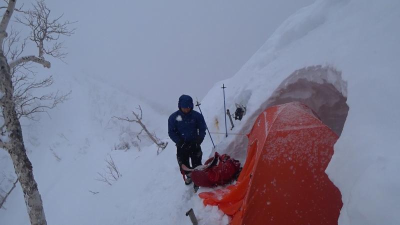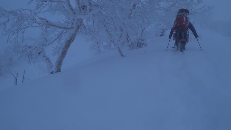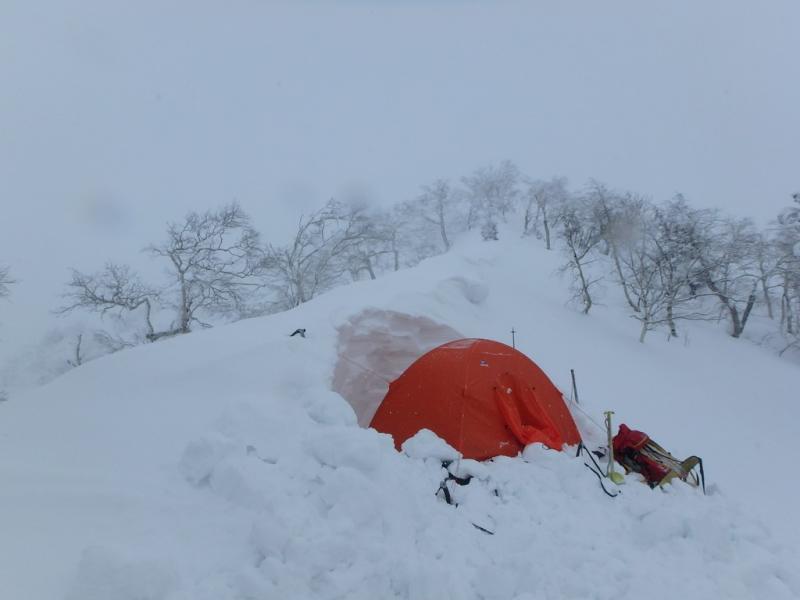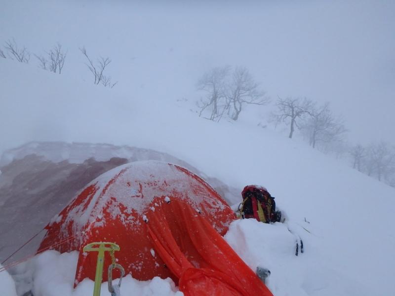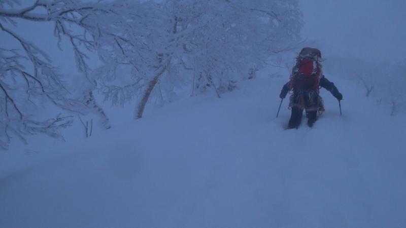 唯一天気が比較的安定していた初日。ニセイノシキオマップ川を詰めて尾根に取り付くもここがかなりの急斜面で消耗。実際にはもう少し沢を詰めたほうが傾斜が落ちて楽でした。尾根上は一気にラッセルが増えて膝から腰付近。1100mの露岩帯も急斜面と不安定な積雪で時に胸近くまで埋没する有り様。寝不足もありスピードが全く上がらない・。次第に天気も下り坂に入り、南稜直下の風の当たらない斜面を切り出しC1としました。