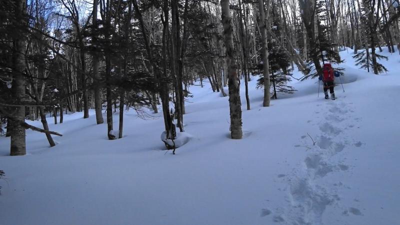 - 降雪がコンスタントに続き、積雪多め。ルート上はスノーシューでも常に腰近いラッセル。