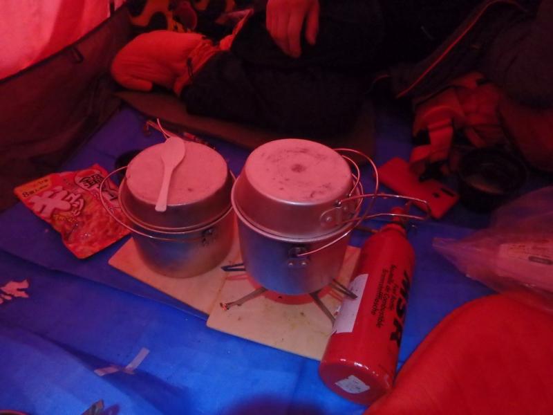 雪が舞う中出発。南稜をぬけて西尾根中間まで歩を進めるつもりも、南稜に上がると再び強烈なラッセル。風も強くなる中、小槍のトラバース斜面にて雪崩の危険性と天候悪化を考慮して行動停止を決める。少し戻った南稜上に斜面を切り出し快適なC2を設置。翌日の天候の回復に一縷の望みを託す。