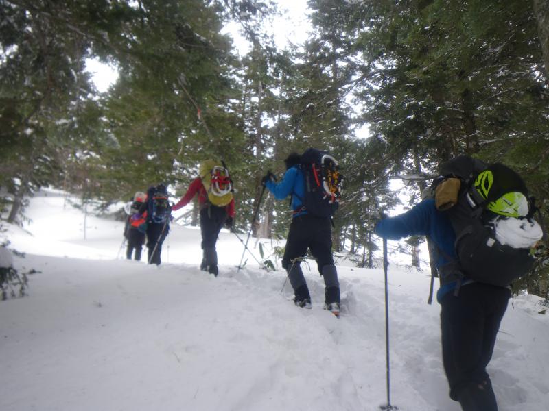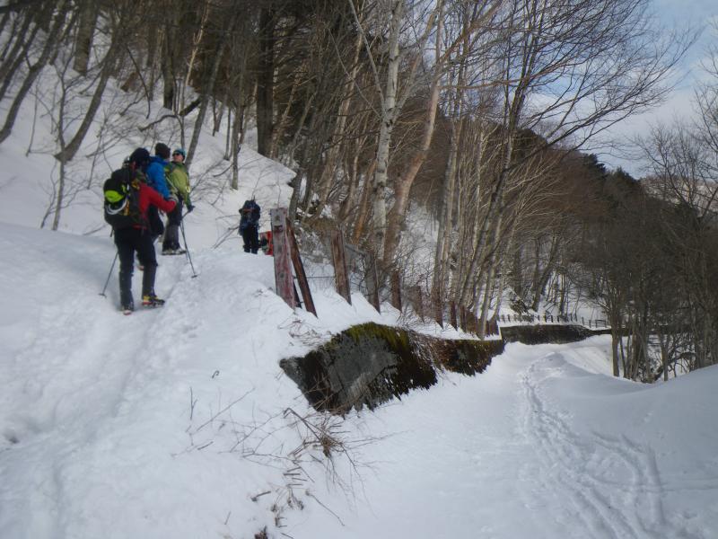 冬季は年中営業の中の湯温泉から登るのが一般的で、展望広場までは樹林帯を進みますが登山口よりアイゼン・スノーシューの装着が安心ですが、今回は連休後ということで、しっかりトレースがありツボ足で充分でした。