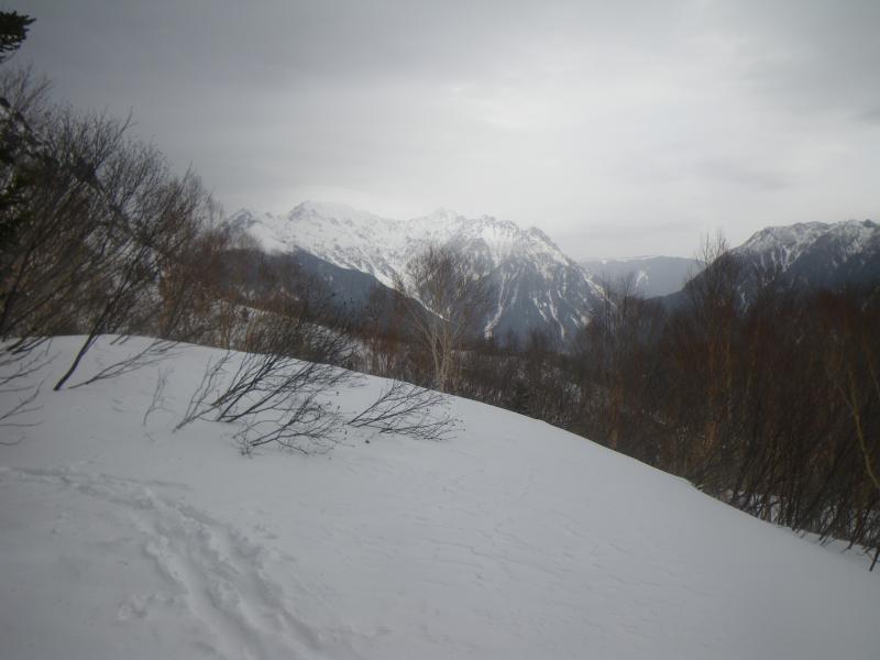 しかし、しばらくすると雪がちらつき、一気にガスで展望は悪くなるものの、焼岳だけは明瞭に見える状態が続きます。
