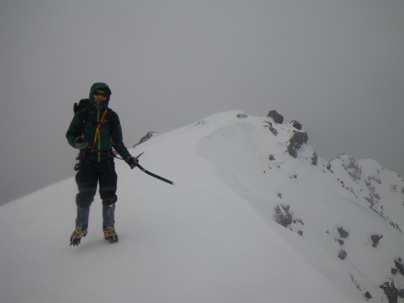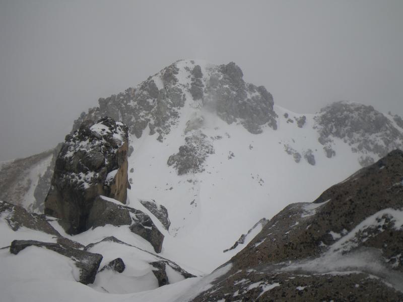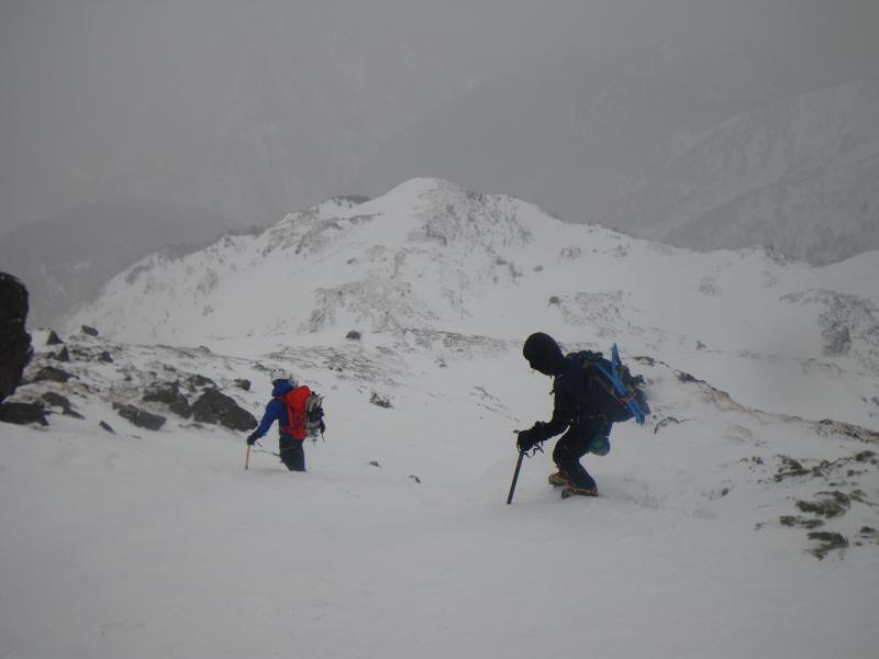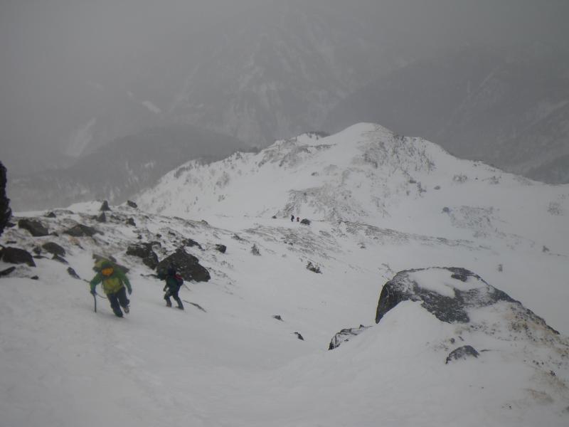 南峰には行ったことがないですが、展望広場から一段上がった所の北峰と南峰の分岐をそのまま直進していきます、昨年、確認済で、しかもトレーズはばっちりで迷うこともなく、ひたすら高度を上げていきます。私は展望広場からスノーシューを装着していましたが、稜線に出る手前の傾斜が増すので、ツボ足の方はアイゼンを装着しました。私は、それほど固くないのでスノーシューで稜線まで上がってしまいました。さすがに風も強くなるのでゆっくりできませんが、向こう側に北峰の標識が見え、また南峰北峰のコルを見下ろしましたが、激しい岩峰で、コルへはやはり、下れそうな感じではありません。
