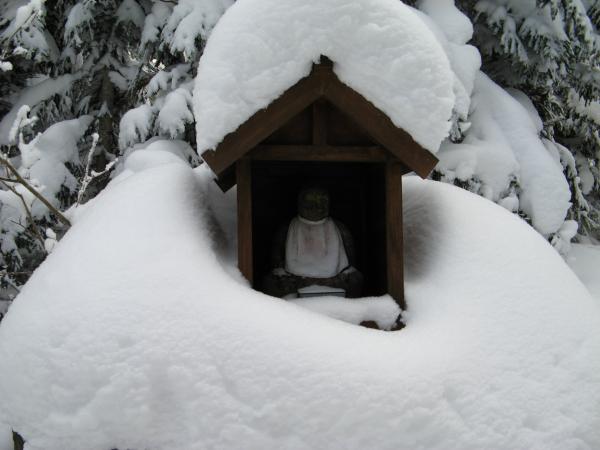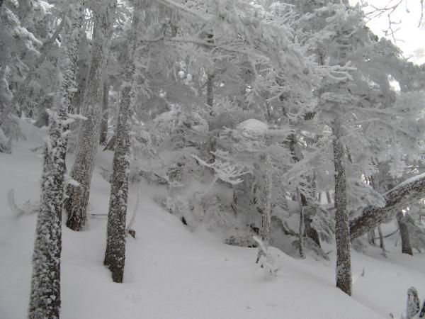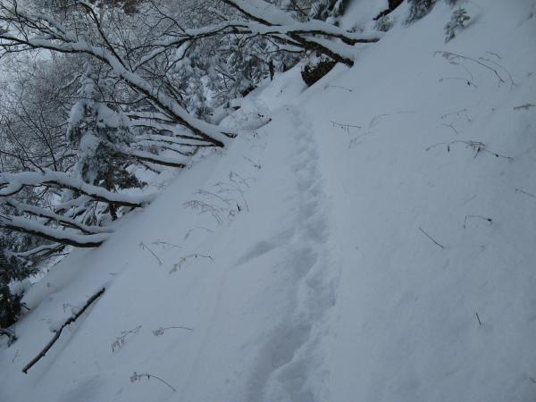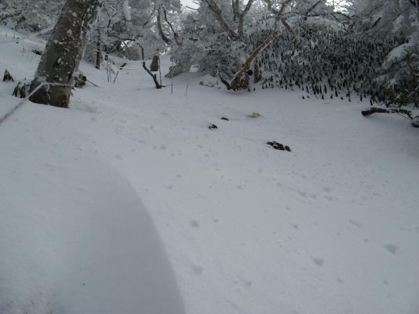七色平から樹林帯が終わるまでの道はテープ・木のペイント・ロープなどがあるのでトレースがなくても迷うことはないと思いますが、これから積雪量が増えていくとかなりラッセルが必要になると思います。