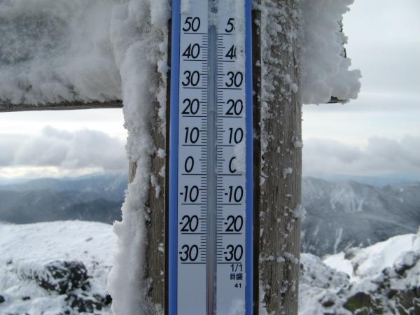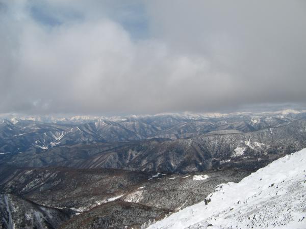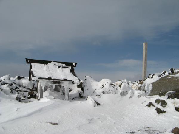 樹林帯を出たところからでは頂上はまだ見えず、夏道が埋まってしまってからは少しウロウロしましたがなんとか頂上に到着。とにかく風が強く寒かったので長居はせず、写真を撮って下りました。晴れてはいたんですが、遠くの山には雲がかかっていて景色がスッキリ見えず残念でした。