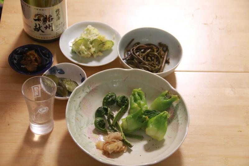 こごみ、友人から頂いた蕨、道の駅のお野菜と「播州一献」で兵庫の恵みを頂きました。