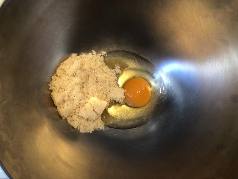 ①ボウルに卵と砂糖を入れ、泡だて器でよく混ぜます。