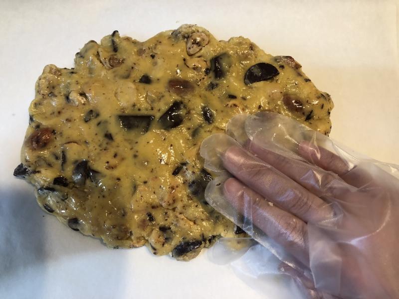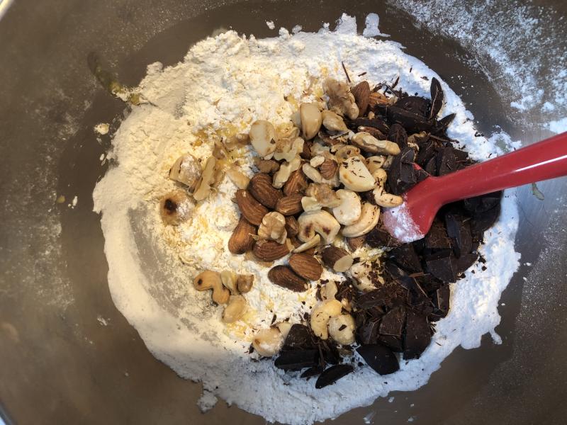 ④ある程度混ざったら、刻んだナッツとチョコを入れます。